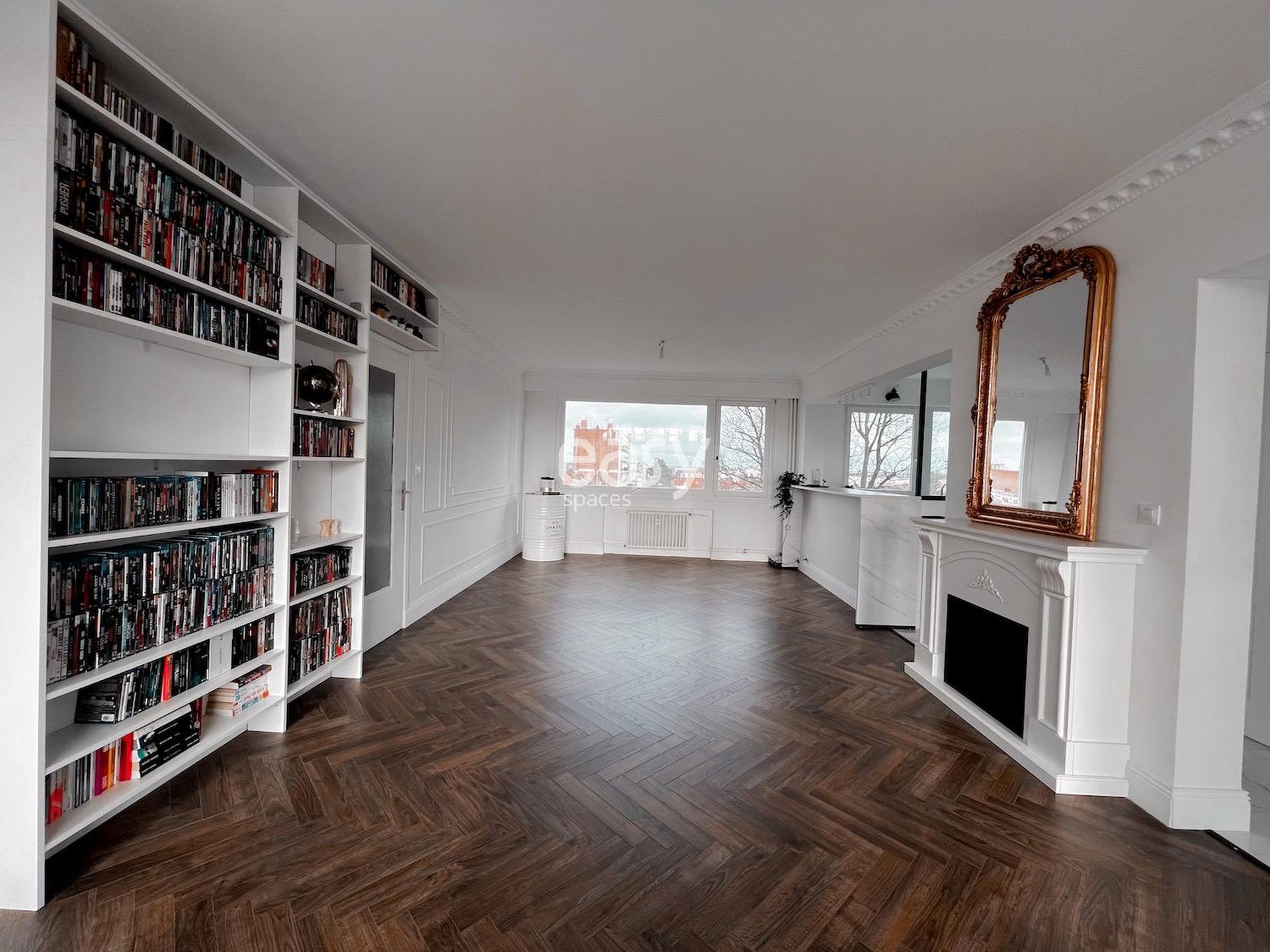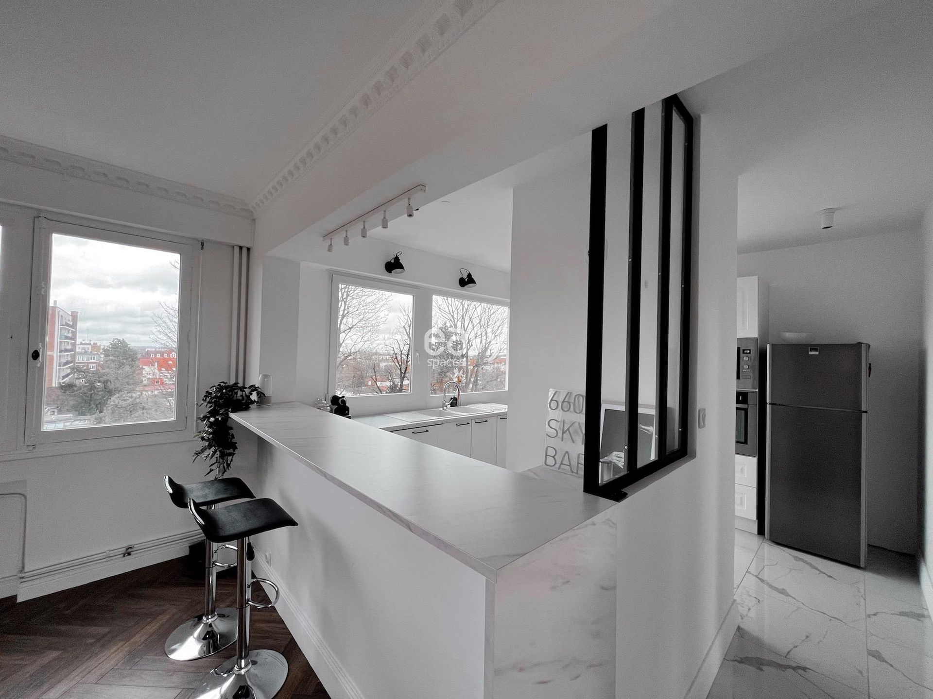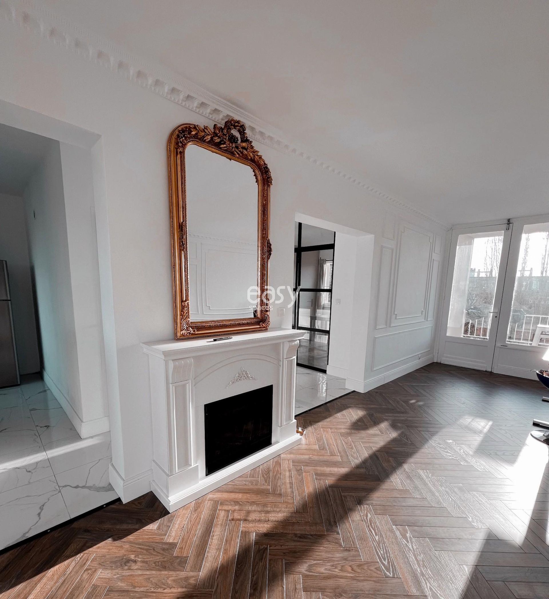 This beautiful modern apartment for rent for shooting and filming in Lille features an entrance with marble flooring, a beautiful bright 40m2 living area with fireplace and parquet flooring, and has a refined decoration in black and white tones.
