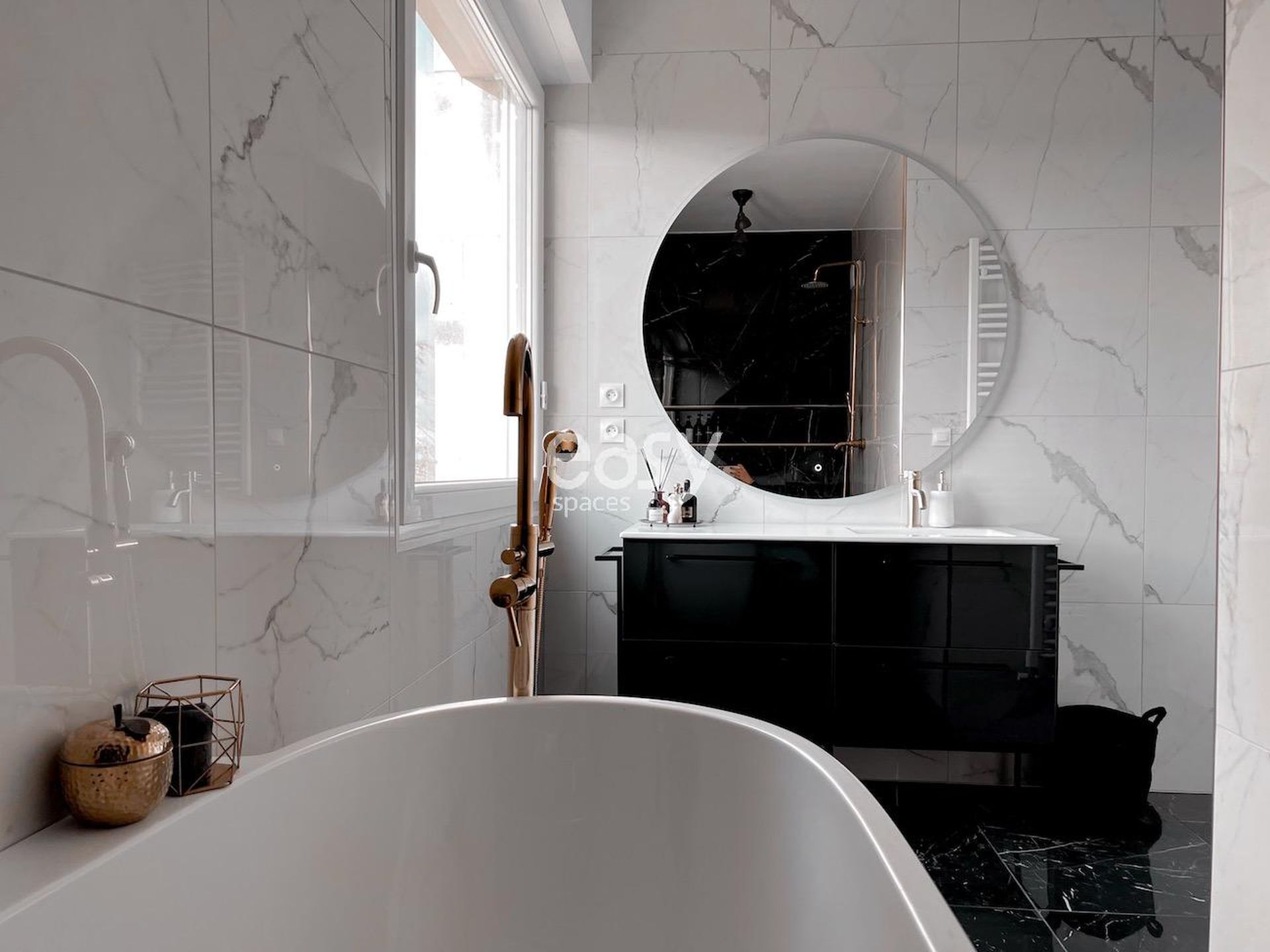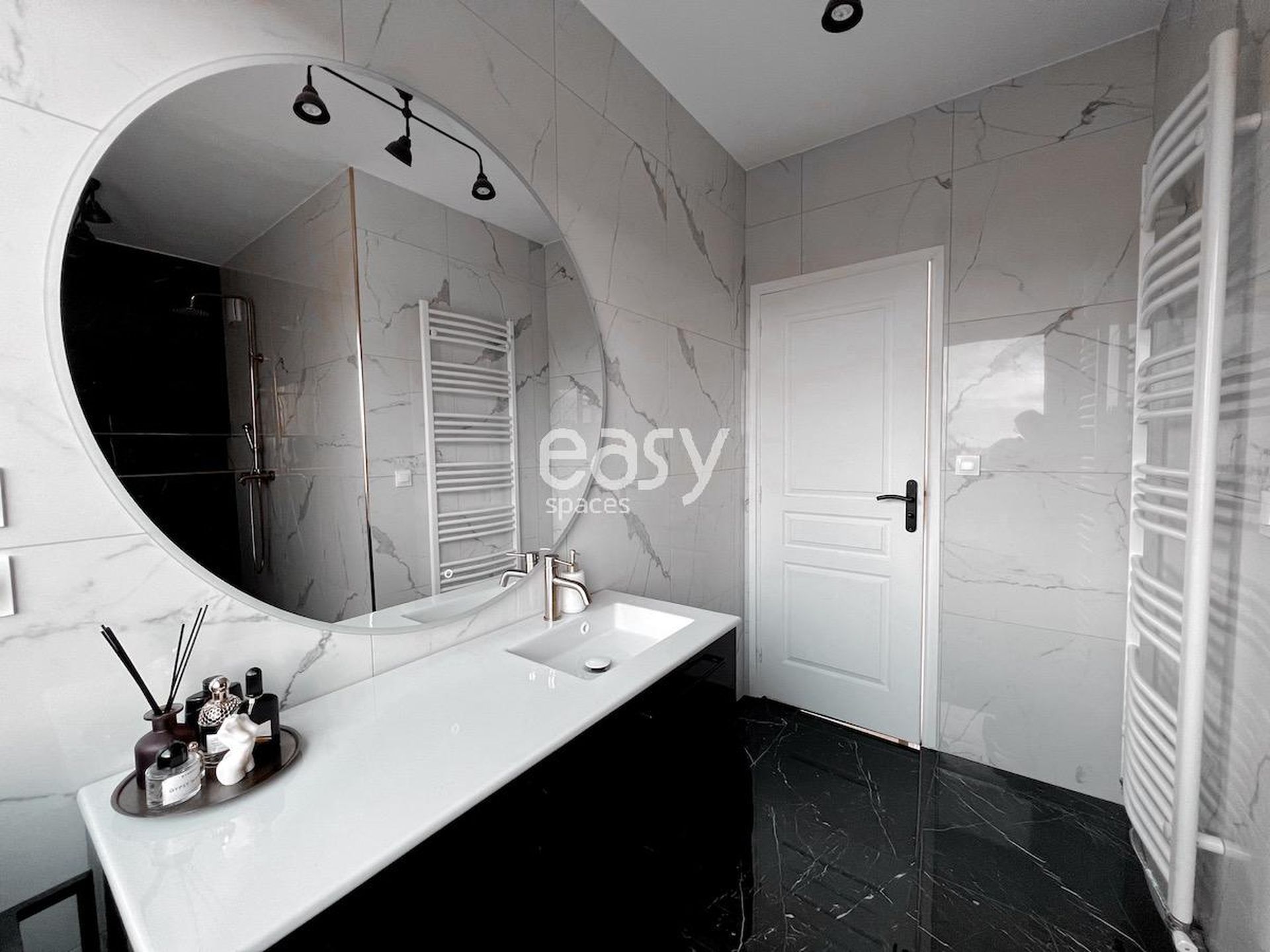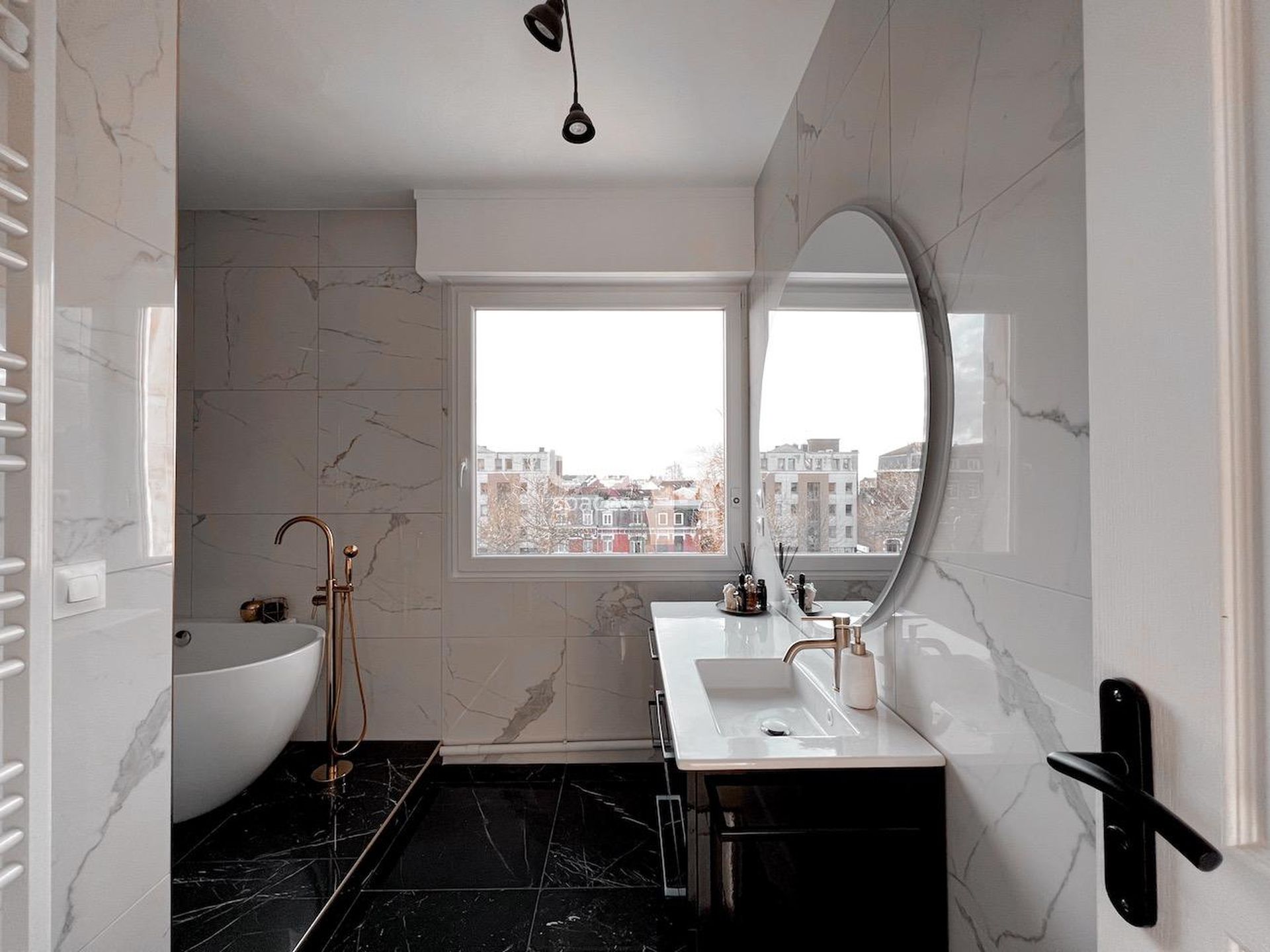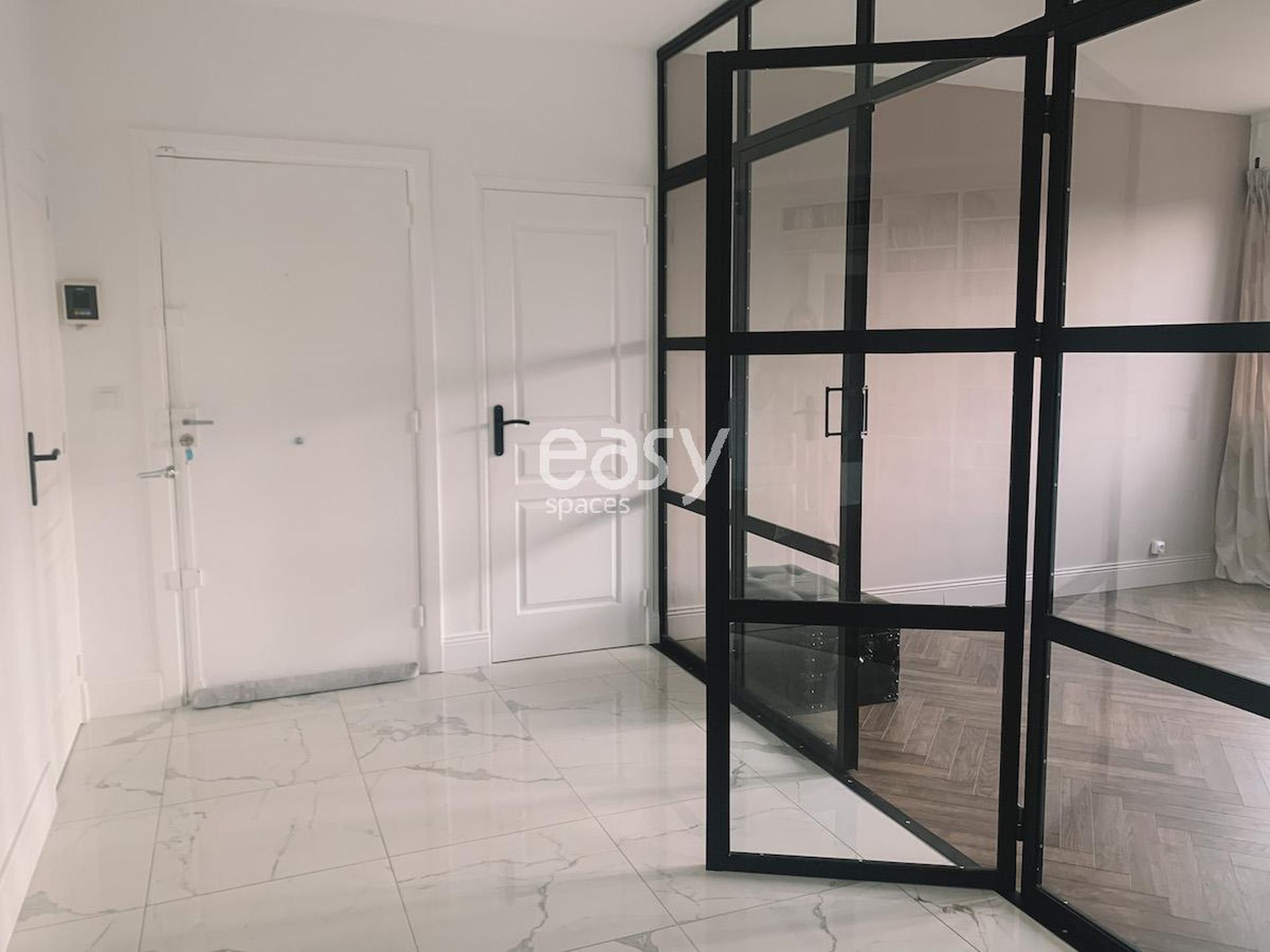 This beautiful modern apartment for rent for shooting and filming in Lille features an entrance with marble flooring, a beautiful bright 40m2 living area with fireplace and parquet flooring, and has a refined decoration in black and white tones.