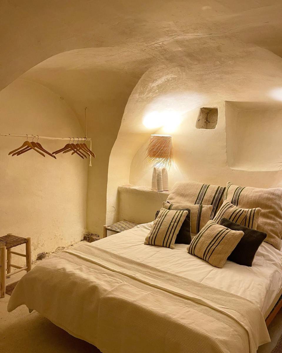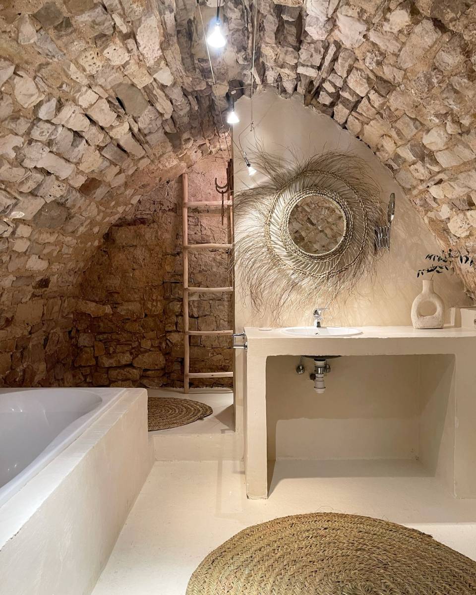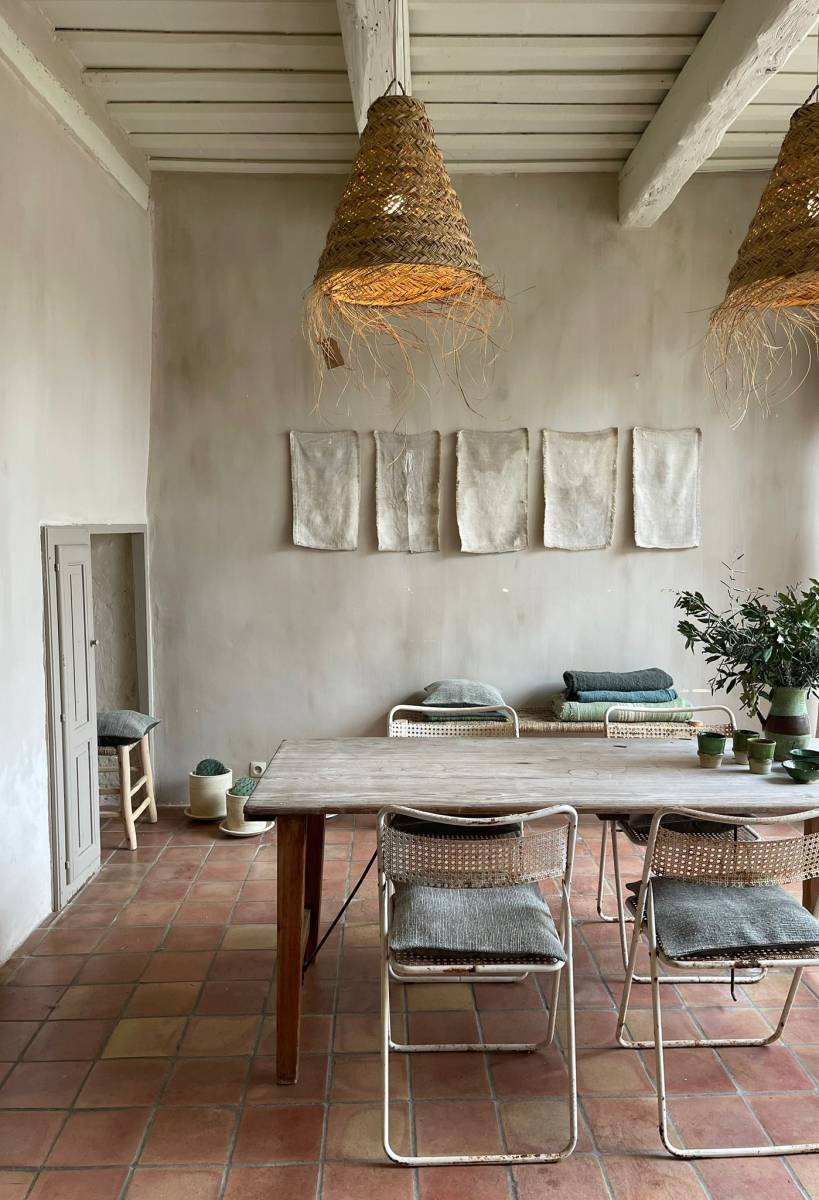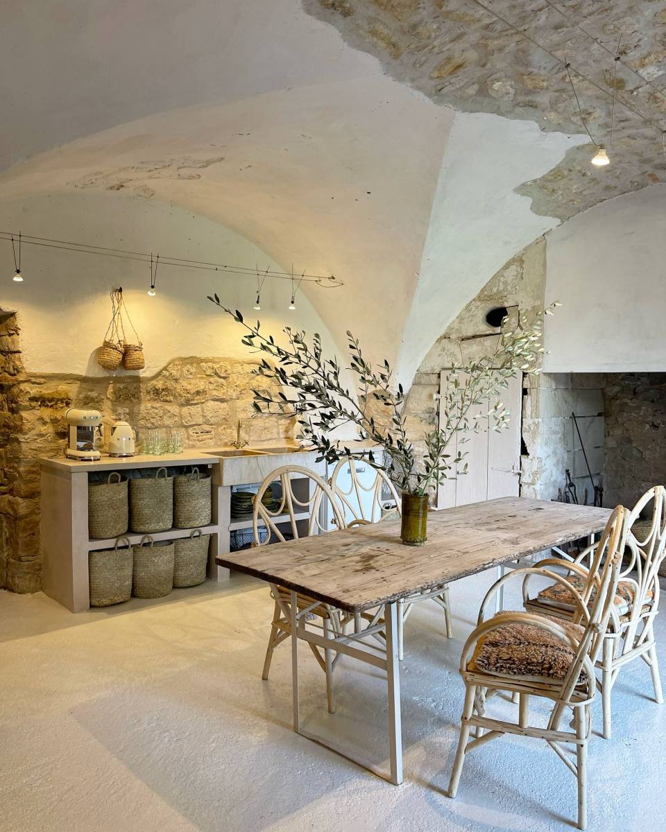 The raw materials — exposed stones, aged wood, natural linen — offer a refined decoration, between chic country style and more contemporary touches.
