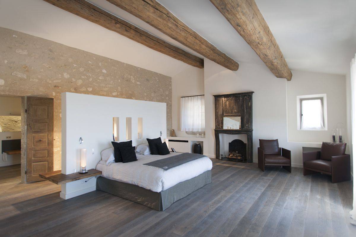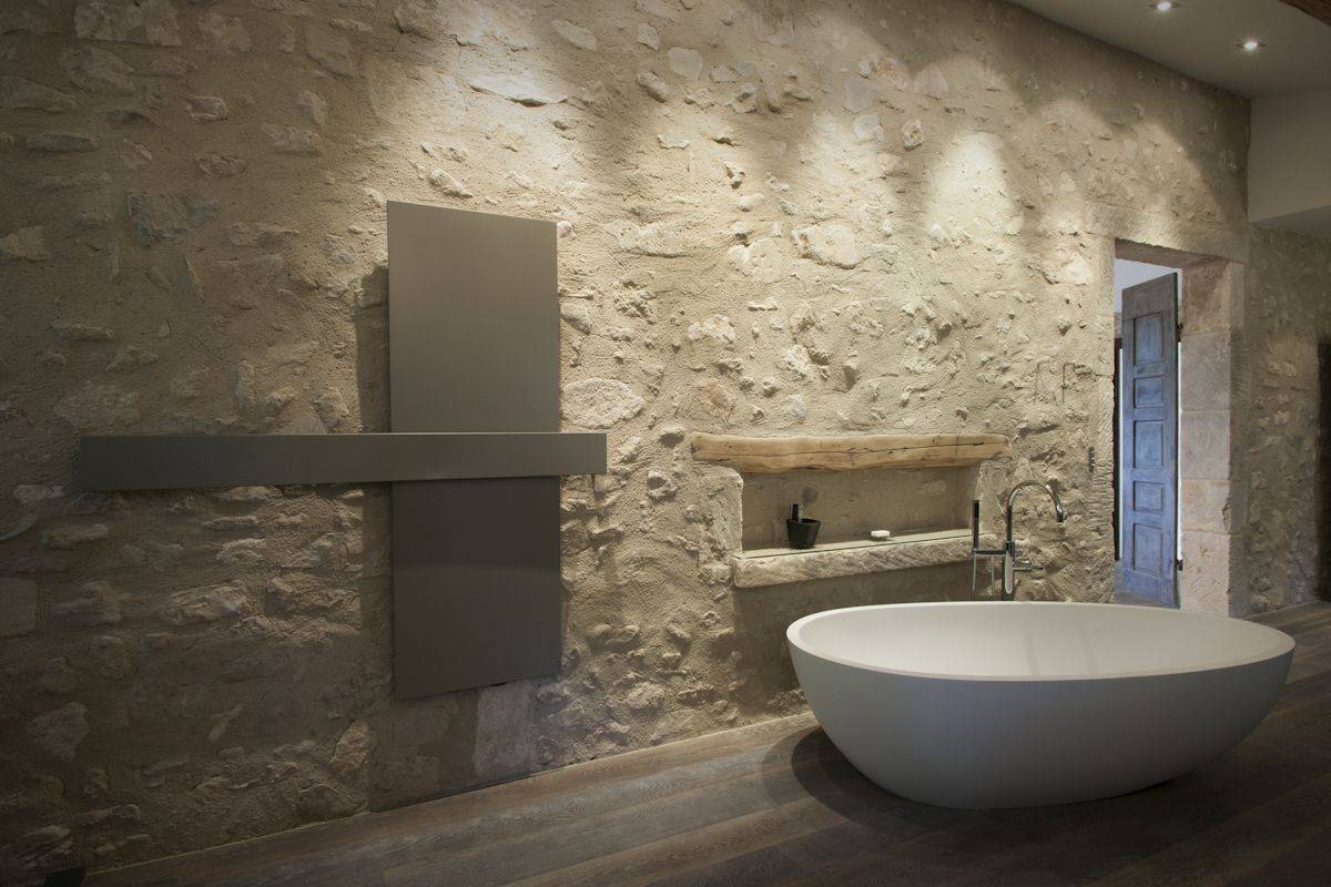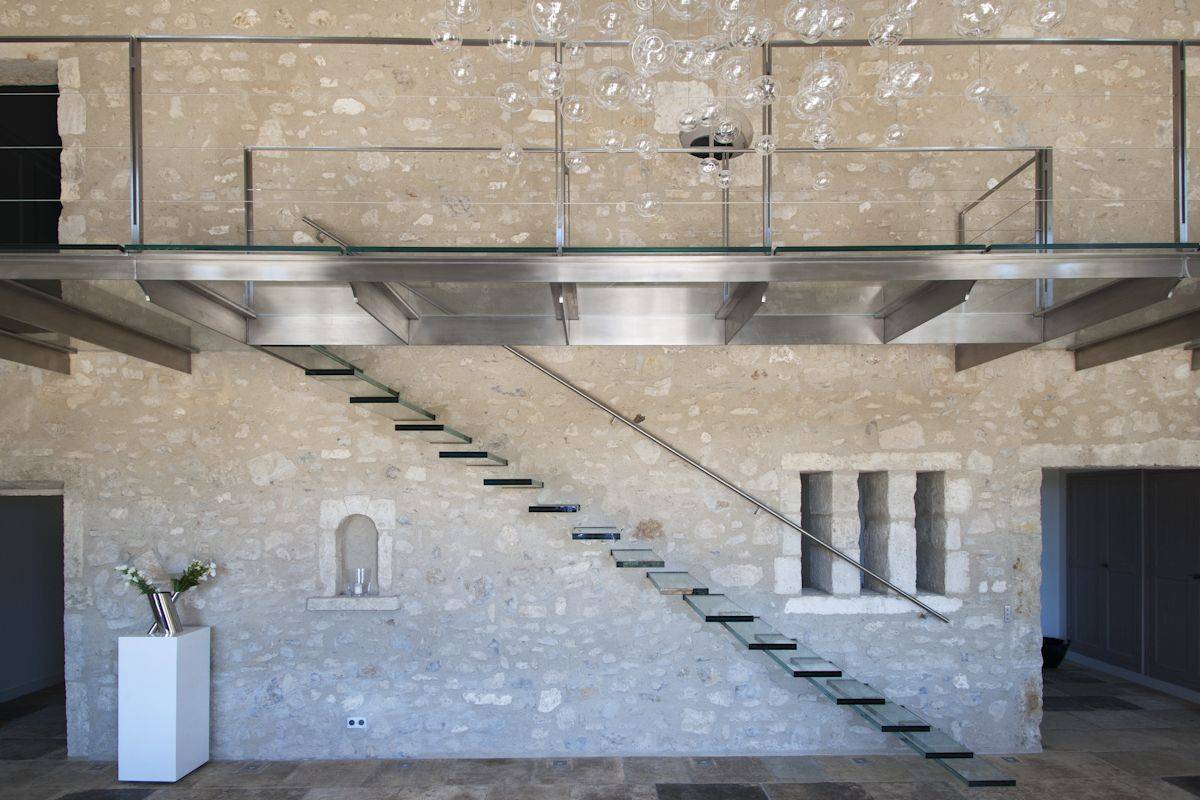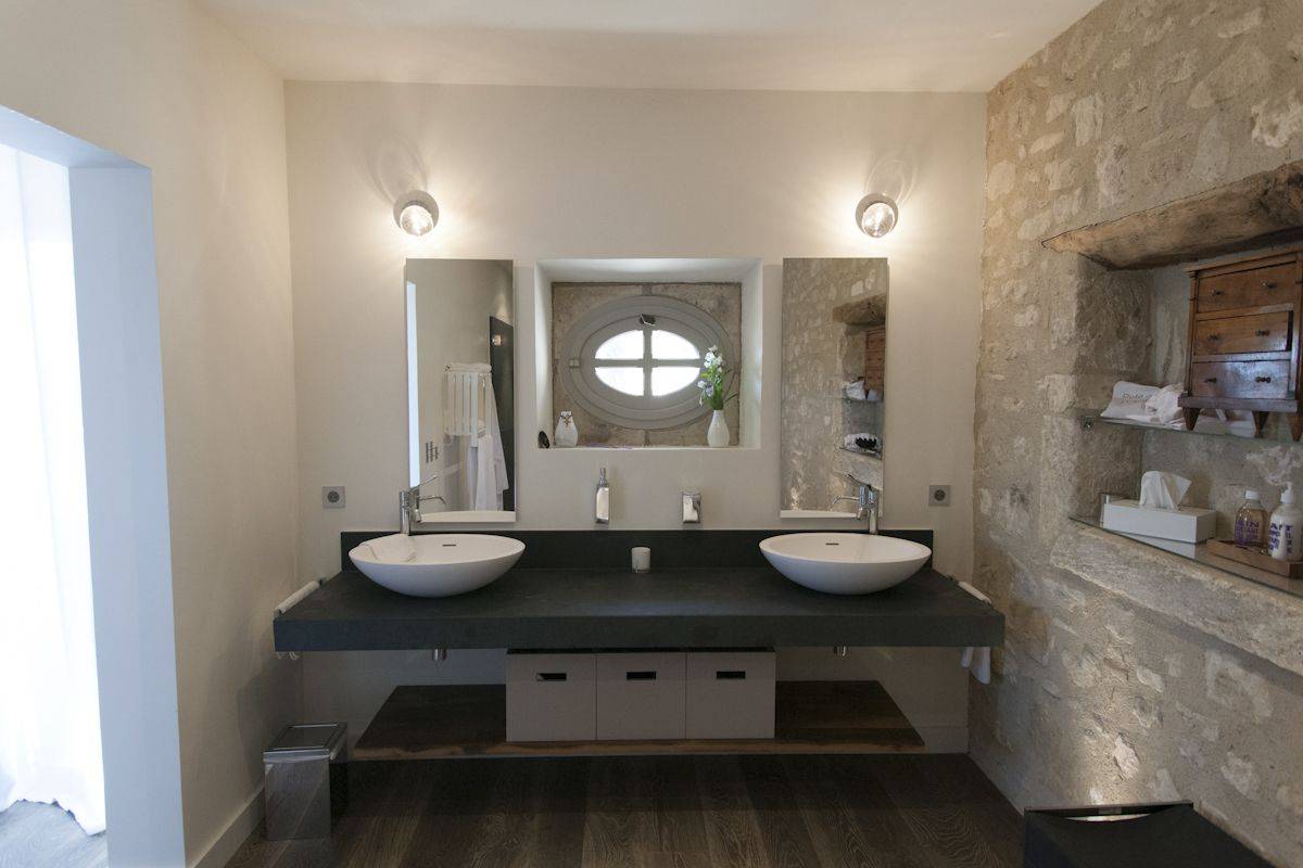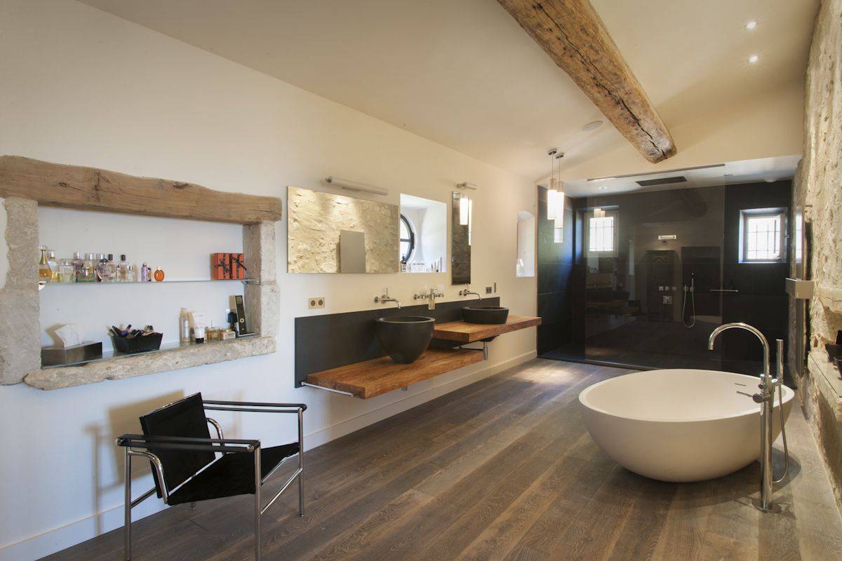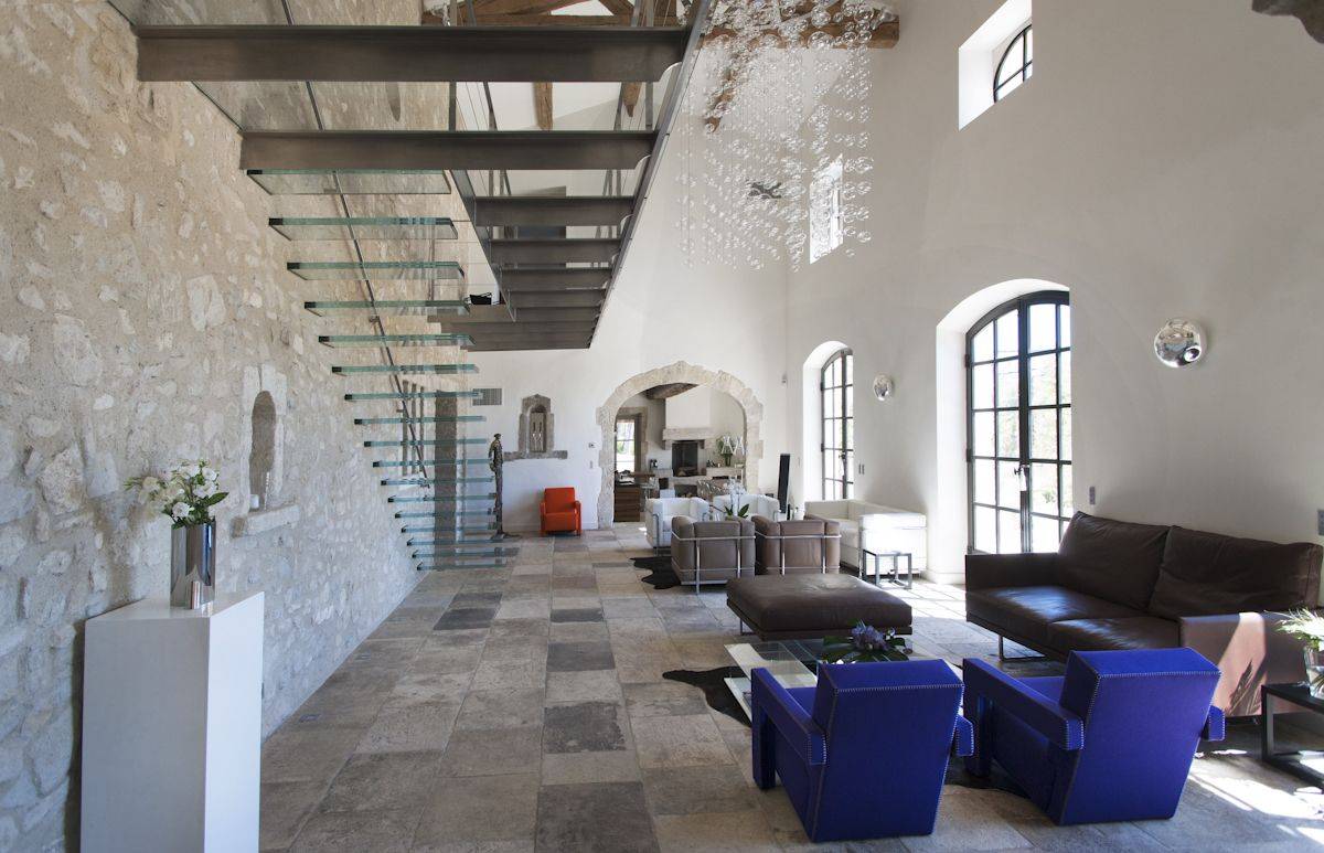 Spacious volumes, modern and sleek loft style, stone walls, interior perfectly blending old and industrial styles, beautiful contemporary basin and landscaped garden.