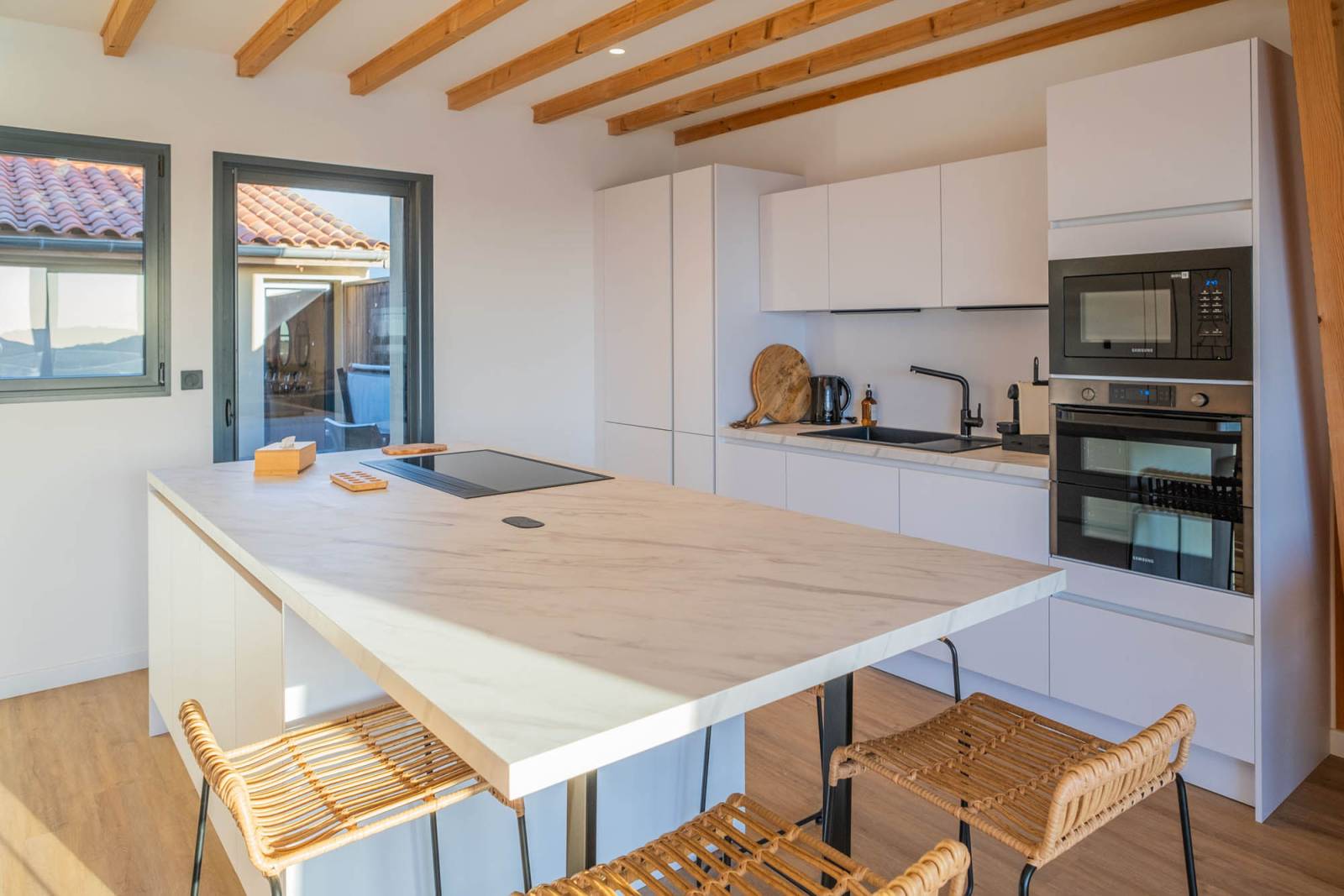 The open, ultra-modern, and fully equipped kitchen integrates harmoniously into the living space, facilitating shooting or product launches.