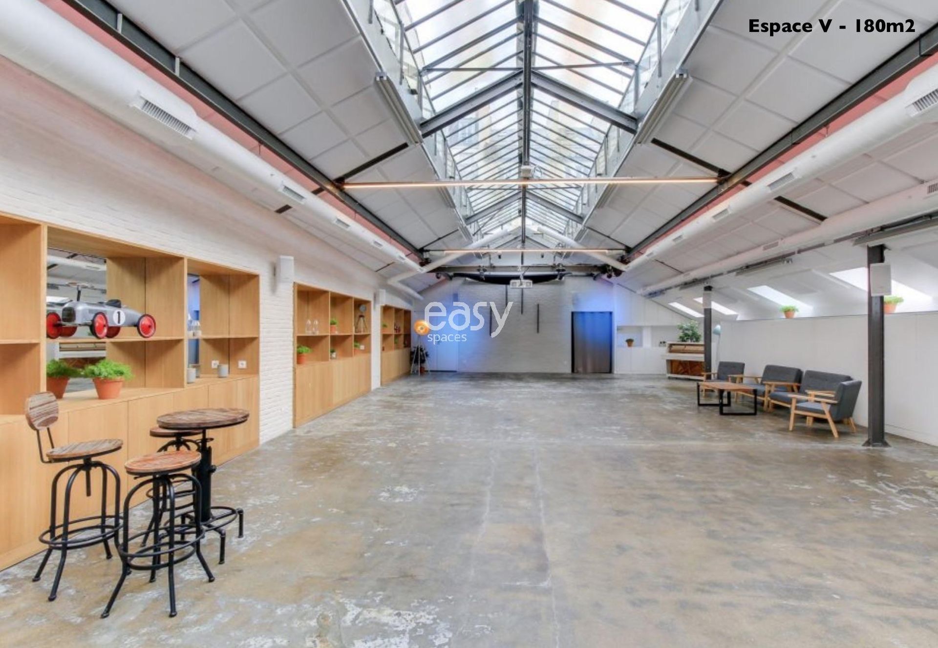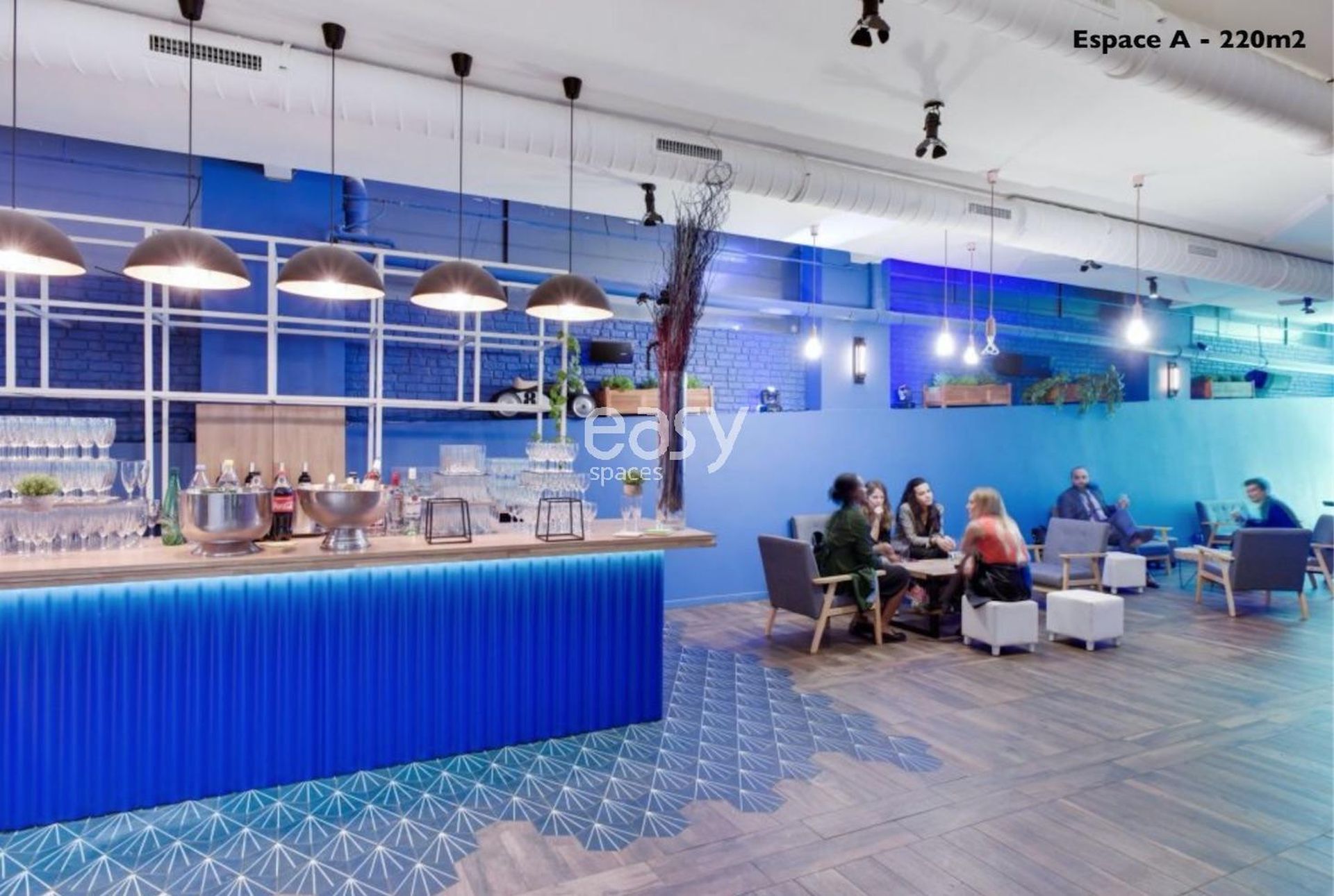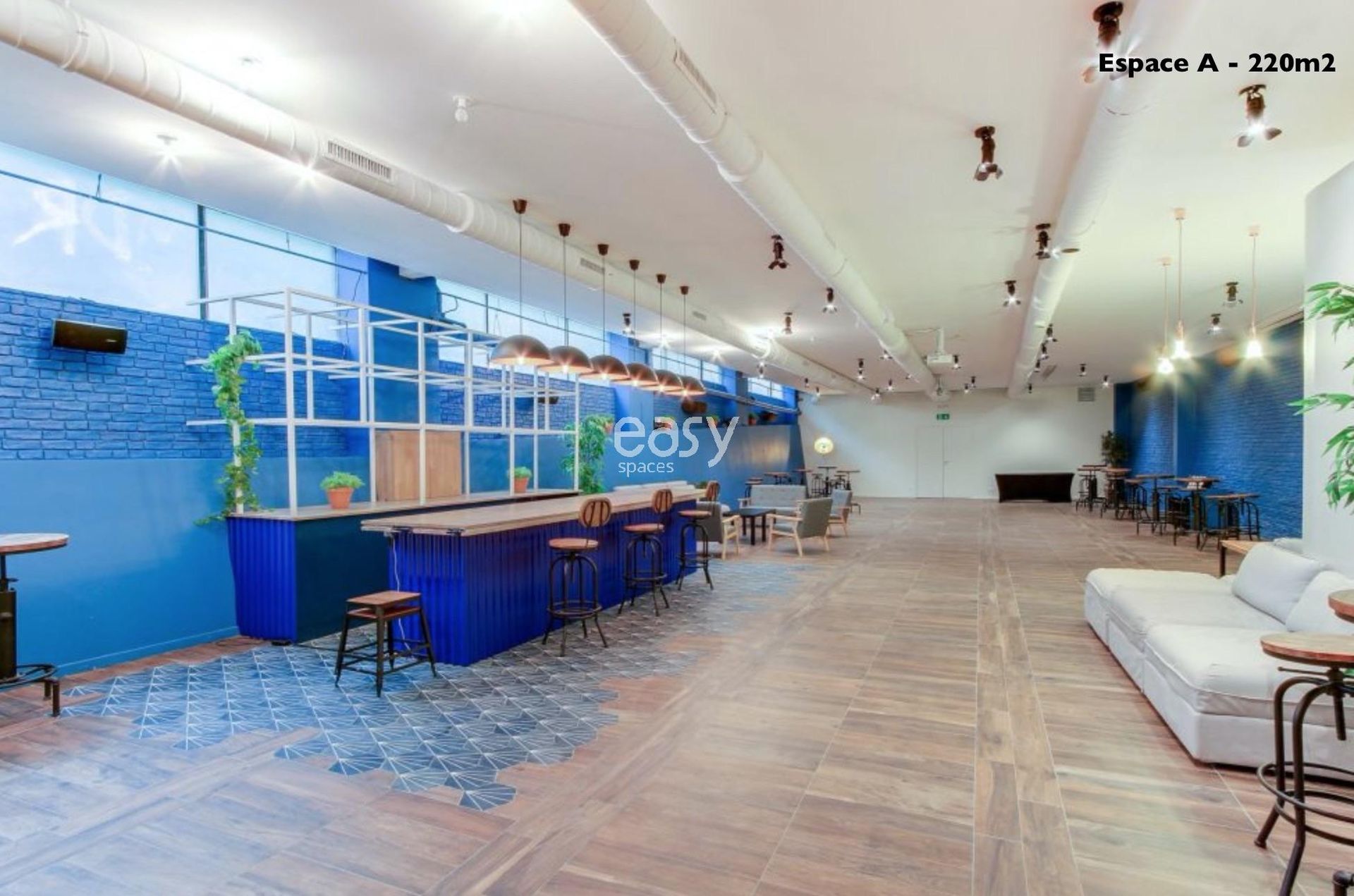 Configuration: Venue with several spaces: Space V with metal structure ceiling 180m2 - Space A with blue wall 220m2 - Space B with terrace 40m2