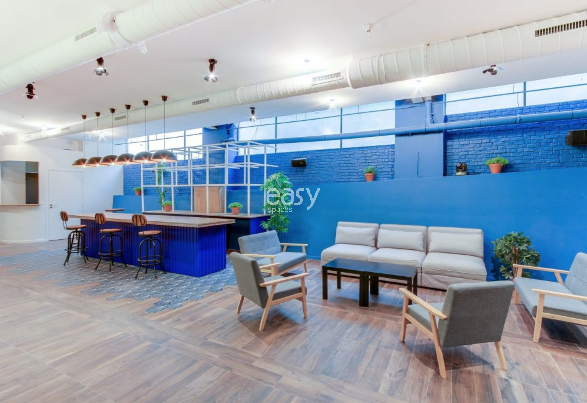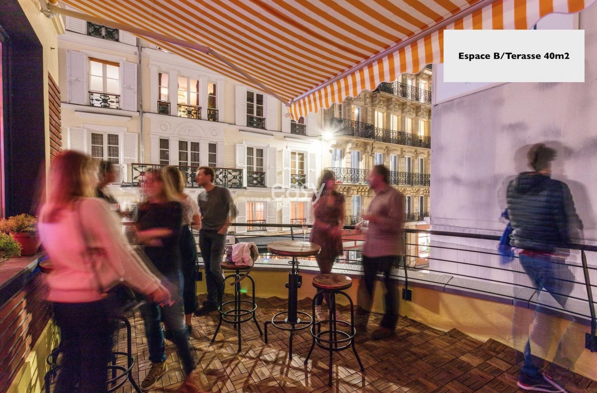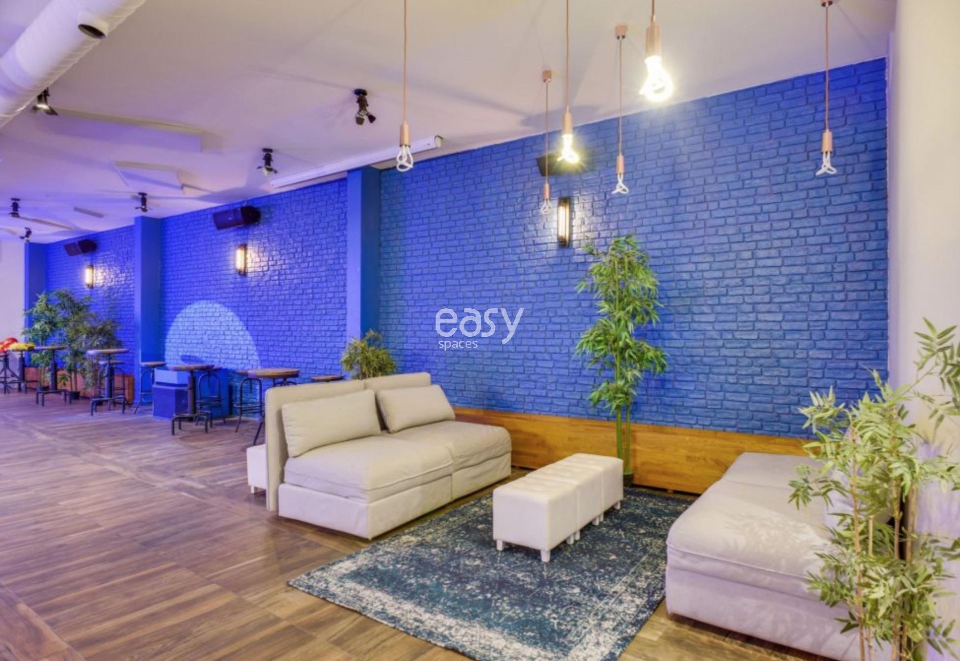 Configuration: Venue with several spaces: Space V with metal structure ceiling 180m2 - Space A with blue wall 220m2 - Space B with terrace 40m2