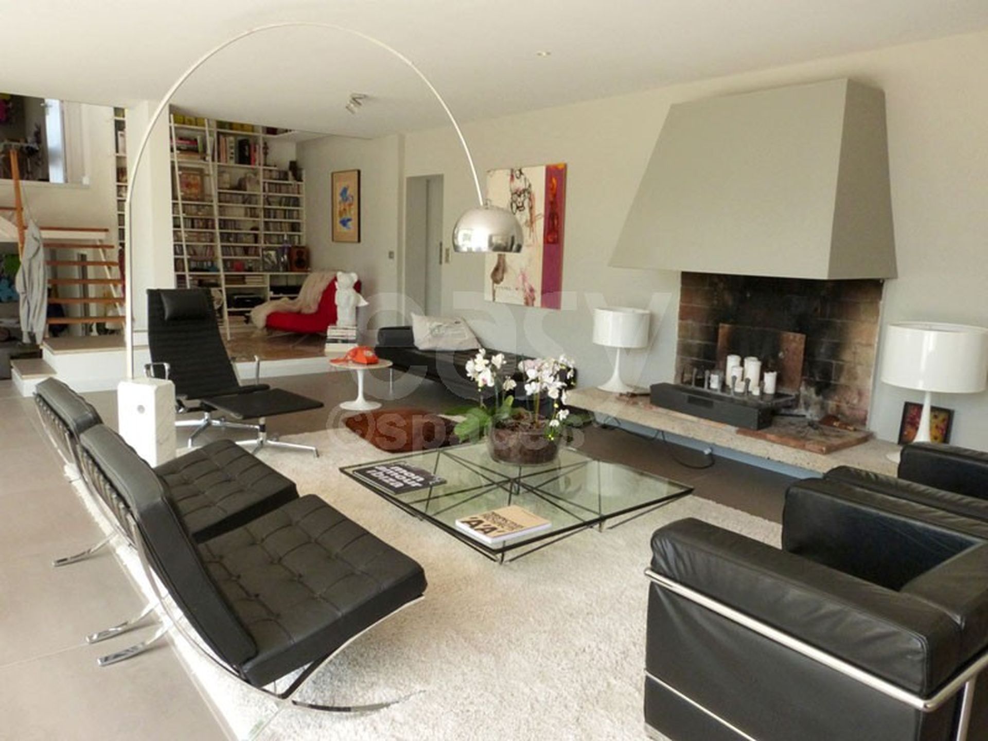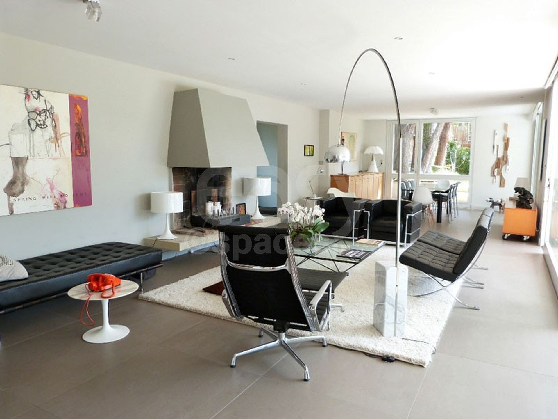 Nestled in a green setting, this contemporary house made of wood and concrete offers spacious and open interiors, carefully decorated with a sober and artistic spirit. The large bay windows generously let in light, ideal for natural light filming and photography.