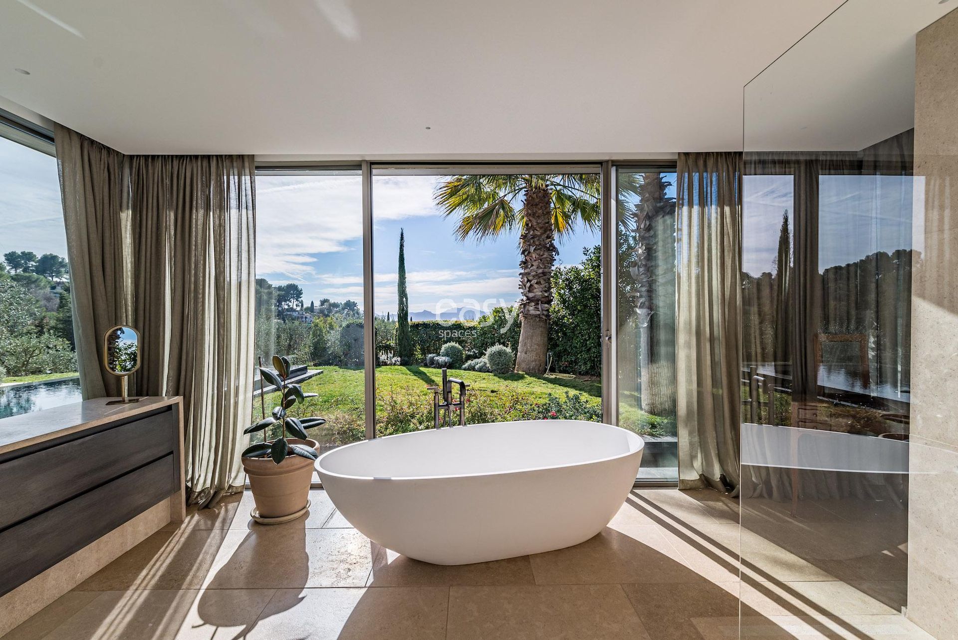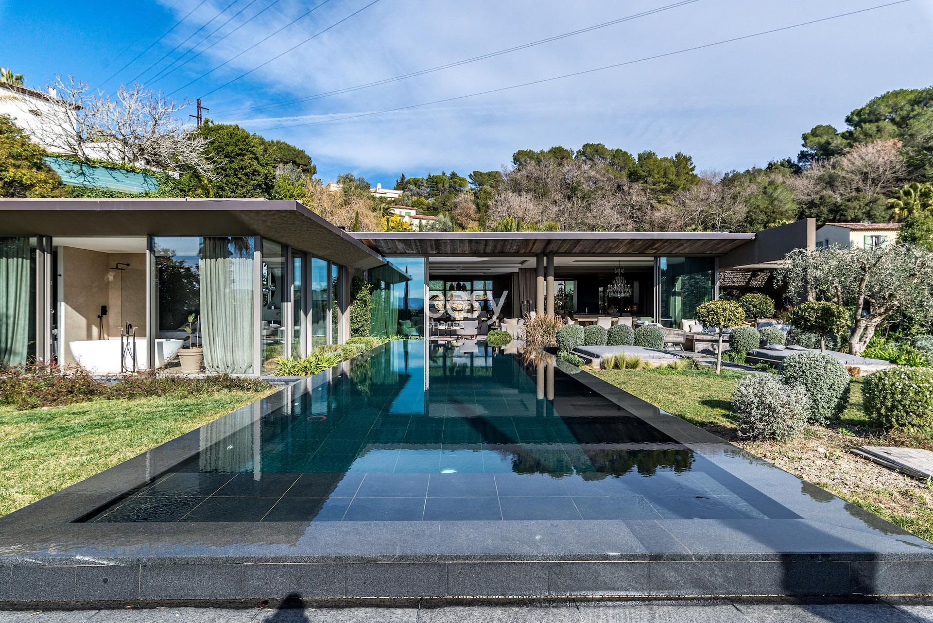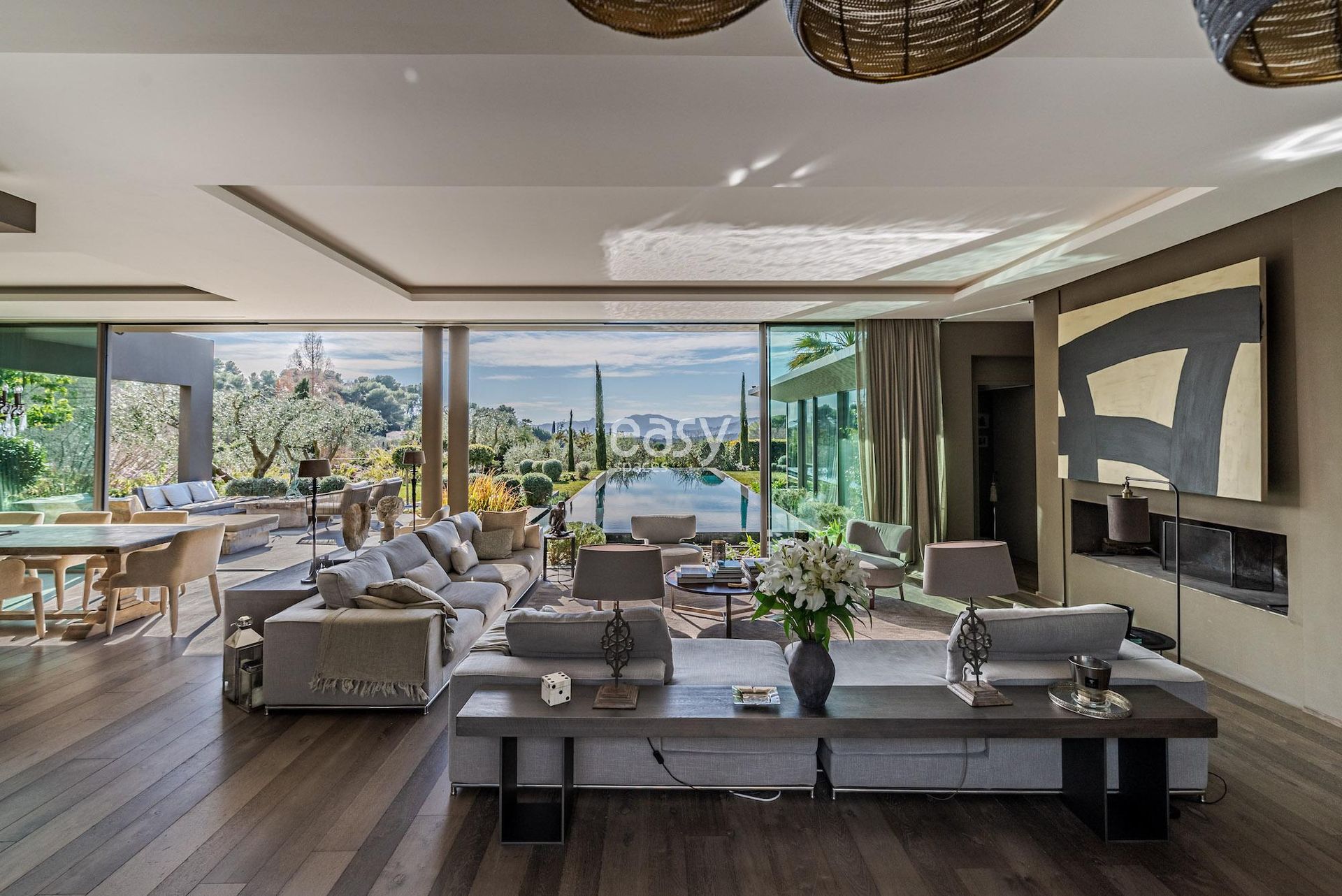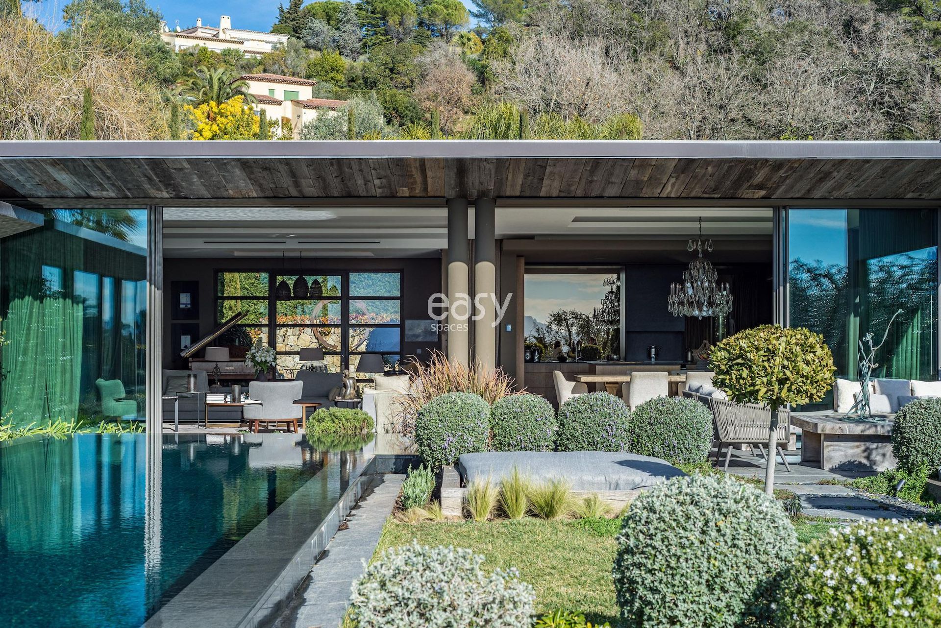 This superb contemporary villa available for shooting and filming near Cannes features a large living space fully open to the pool and the outdoors.