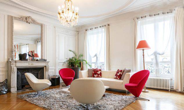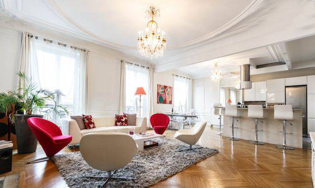 Haussmannian features such as the parquet flooring and moldings provide an immediately recognizable visual signature, while the designer and classic chic decor modernizes the overall look.