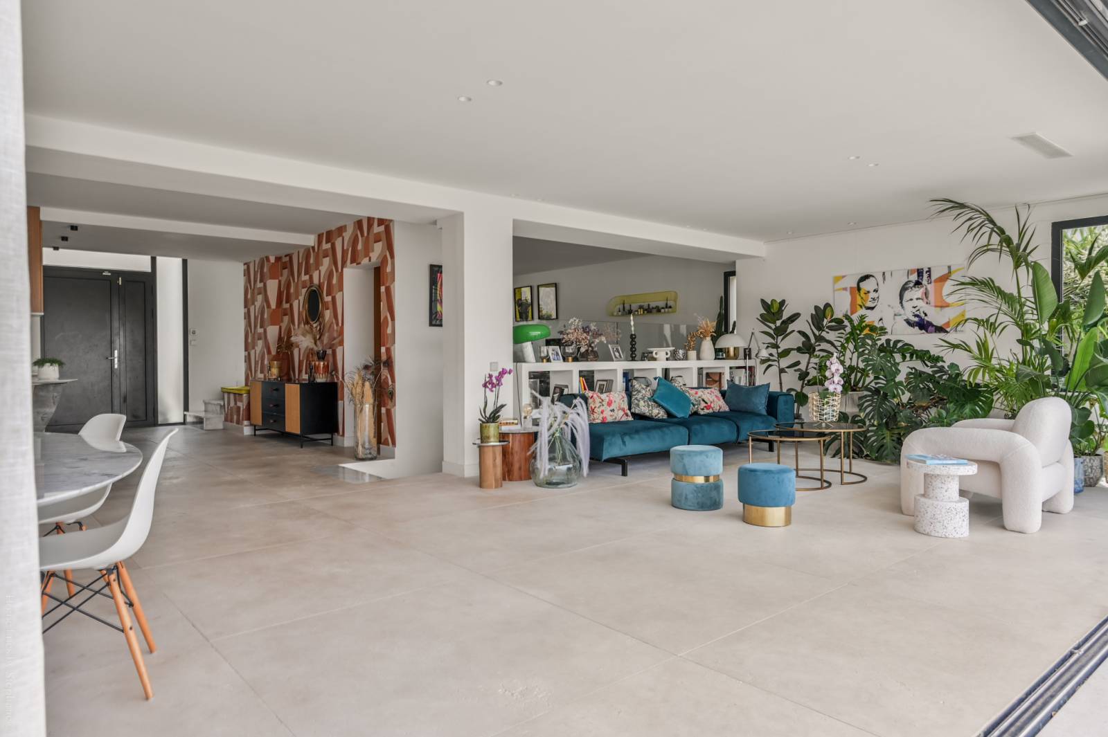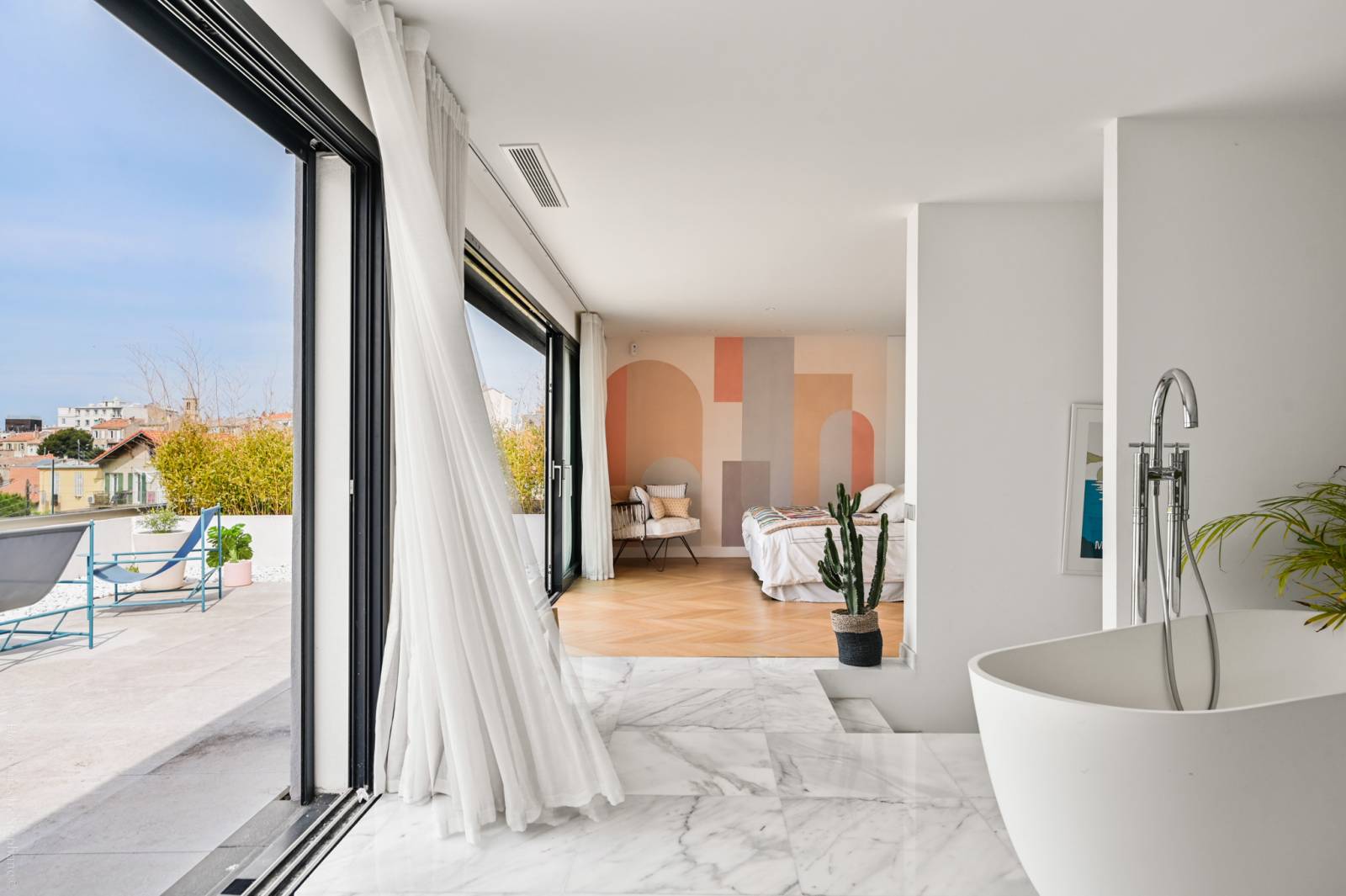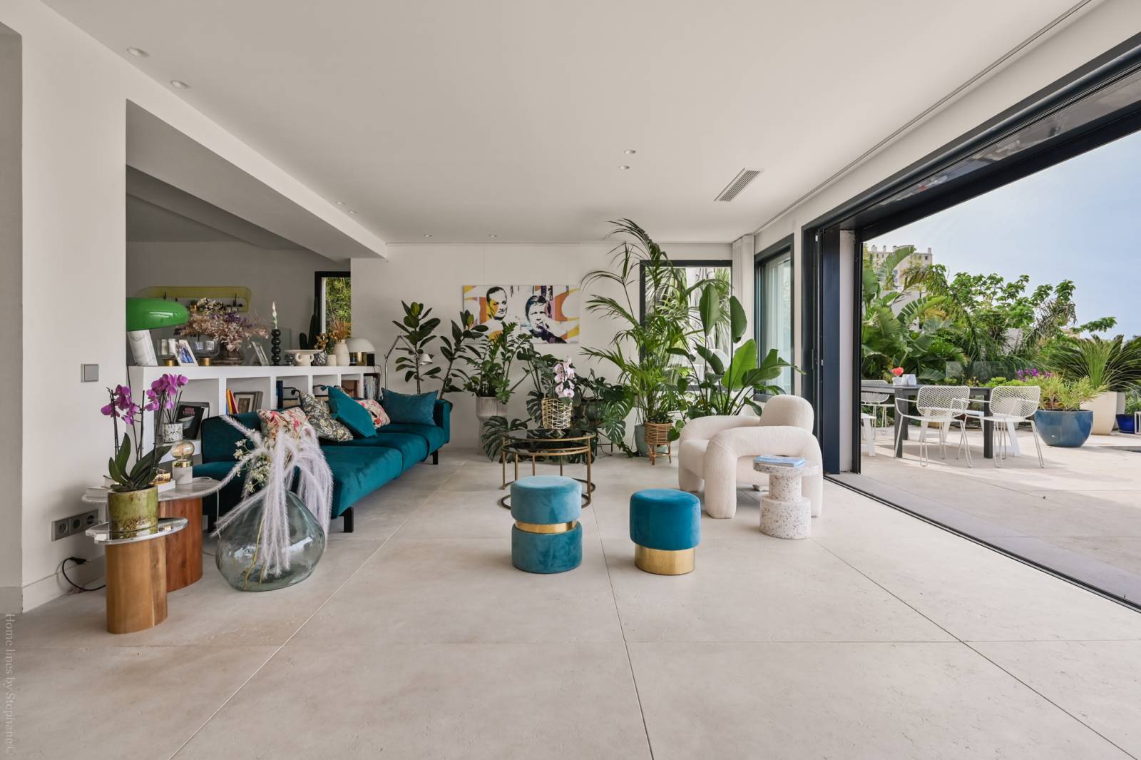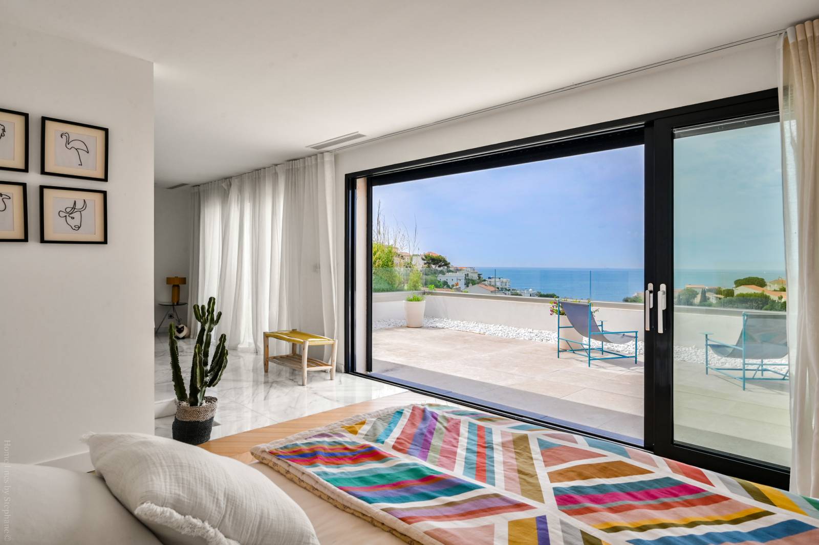 The house features a large open and very bright living room, an open kitchen, beautiful bathrooms, and a superb terrace with sea and urban views ideal as a cocktail venue for a product launch, for example.