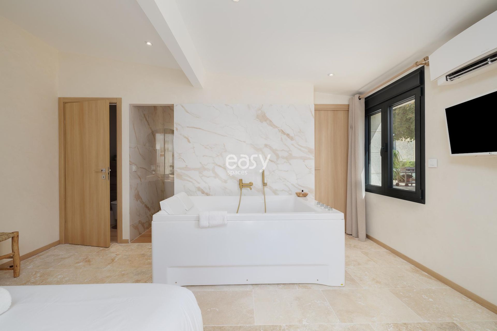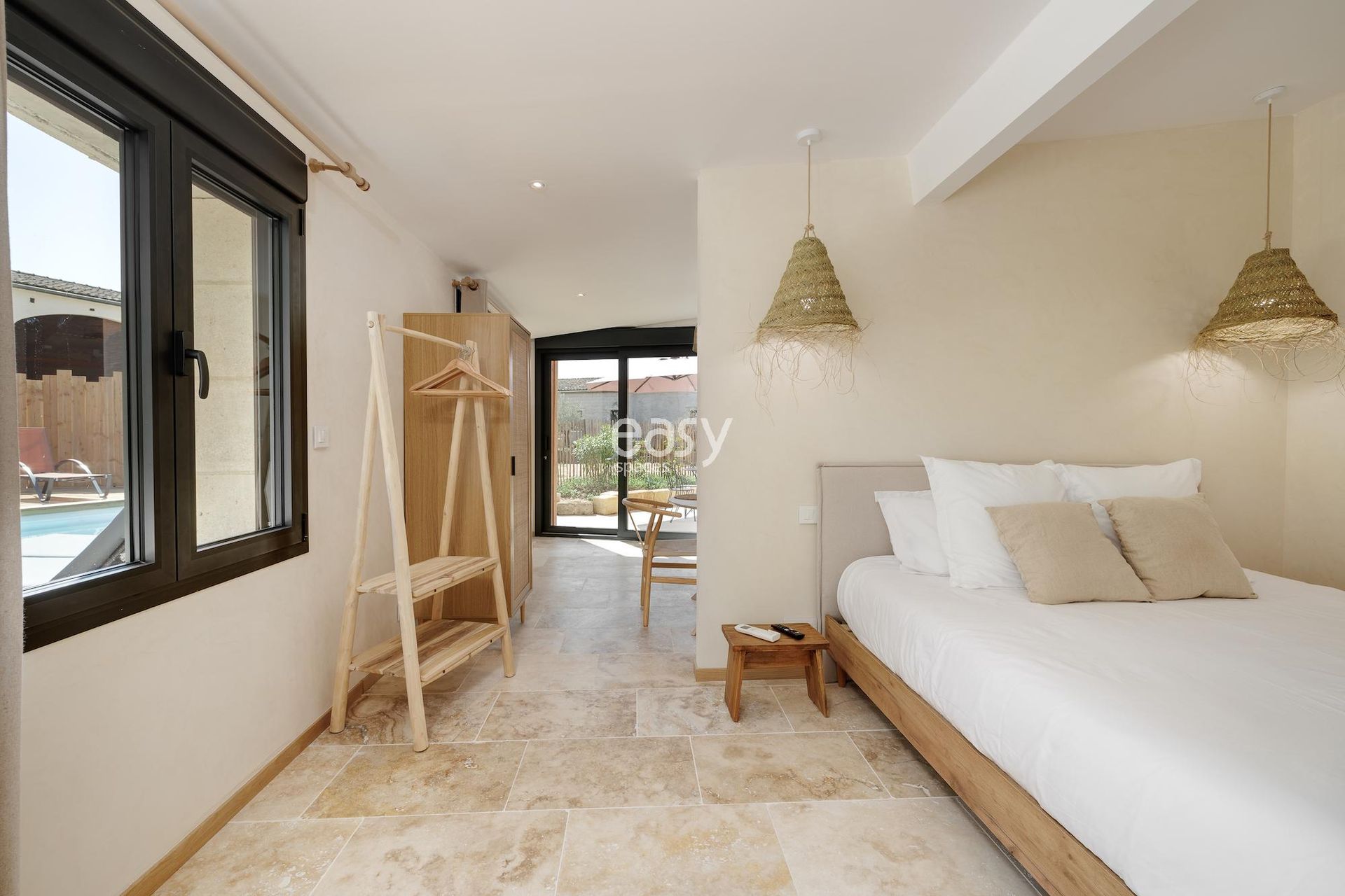 Featuring a beautiful and bright 35m2 living space with parquet flooring and a fireplace, an open kitchen facing the outside, and decoration perfectly combining old exposed stones with modern style, this set will be ideal for all types of projects.