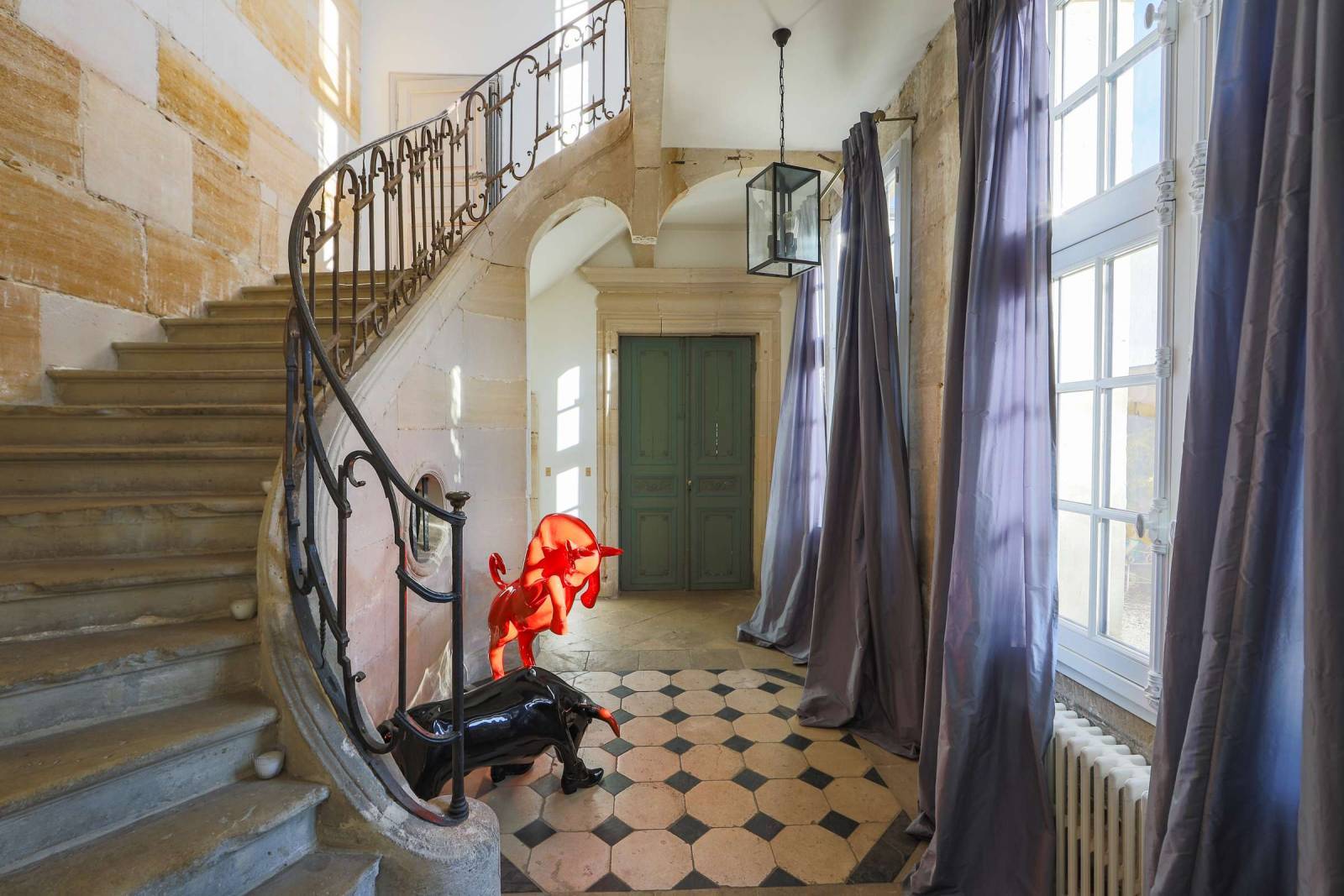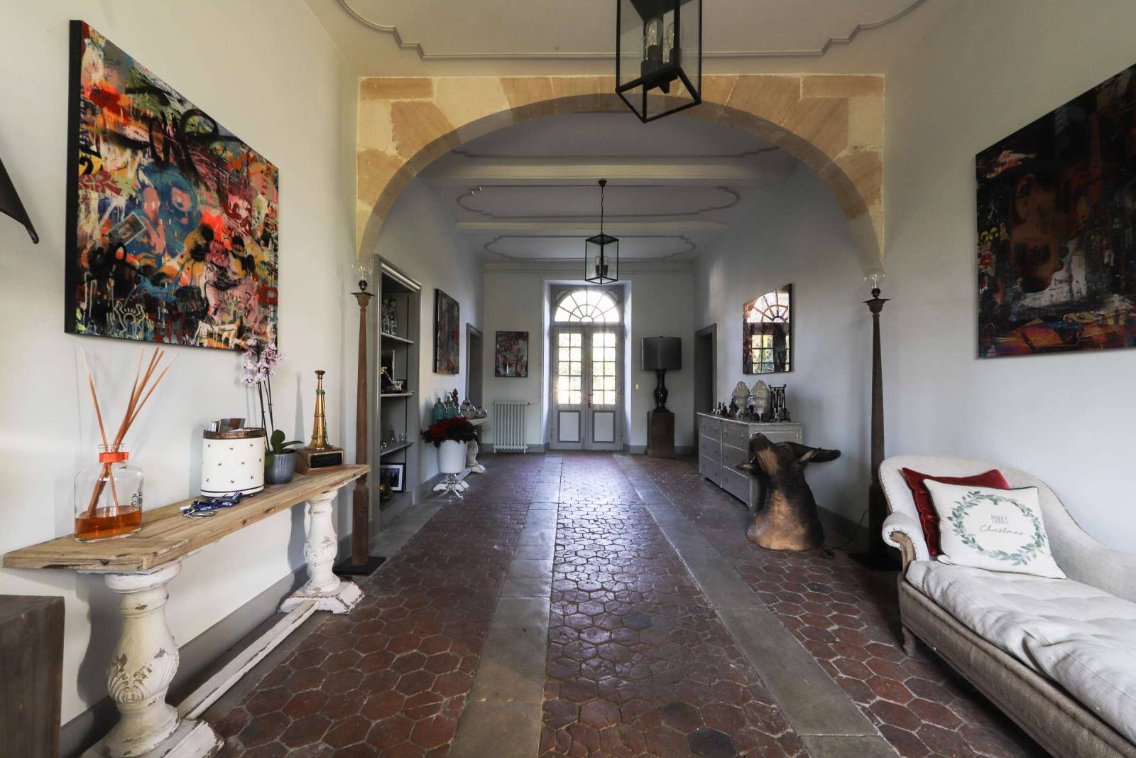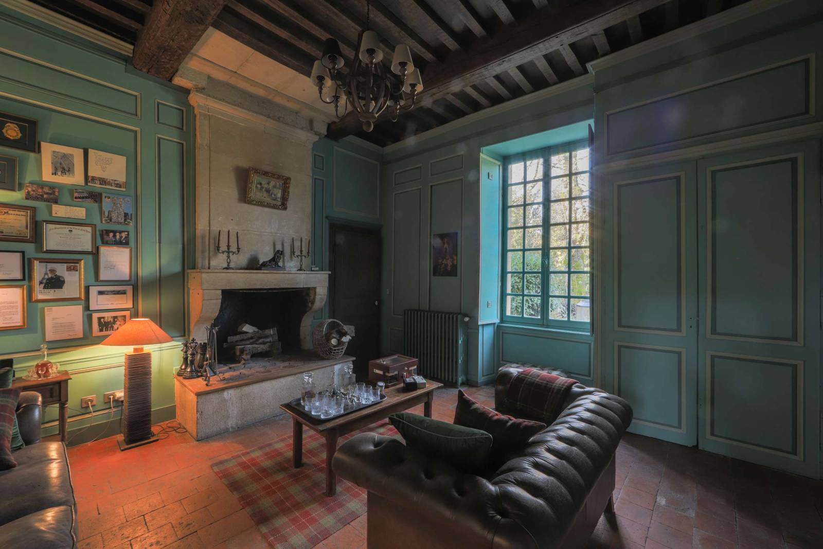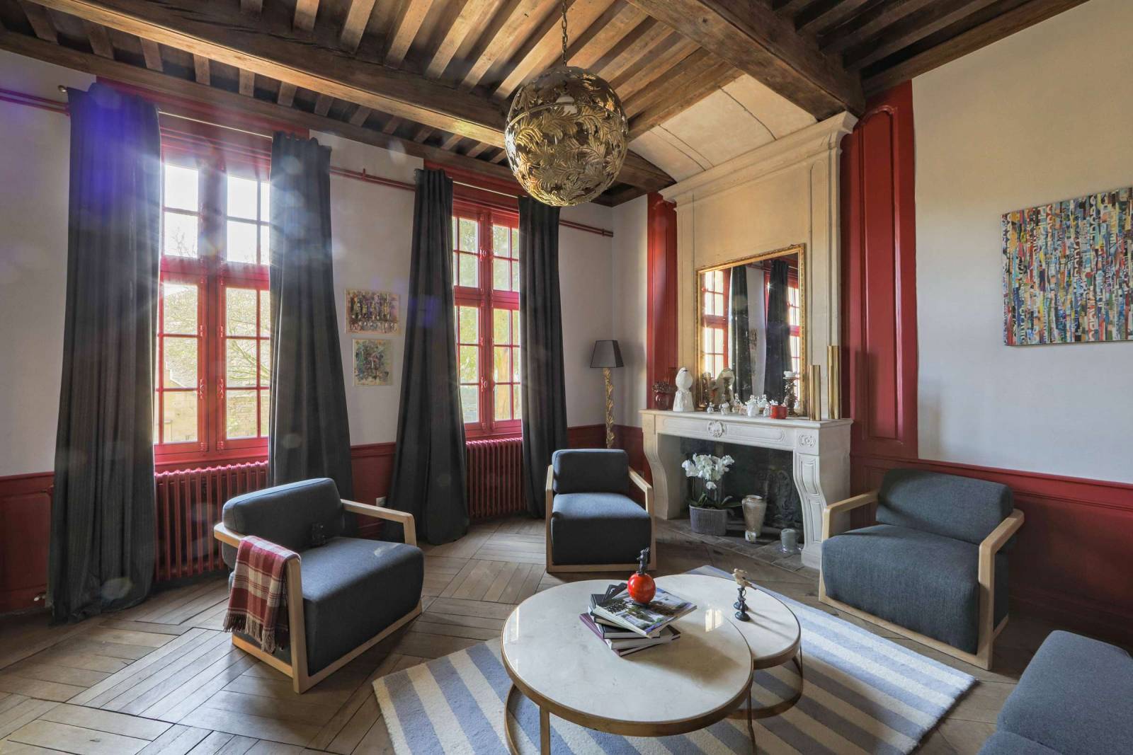 This 750 m² property combines 18th-century architecture with classic interior design. Several salons with distinct visual identities structure the space: a green salon with deep wood panelling and a stone fireplace, a library with integrated patinated blue shelving, and reception rooms featuring antique parquet floors, mouldings and chandeliers.