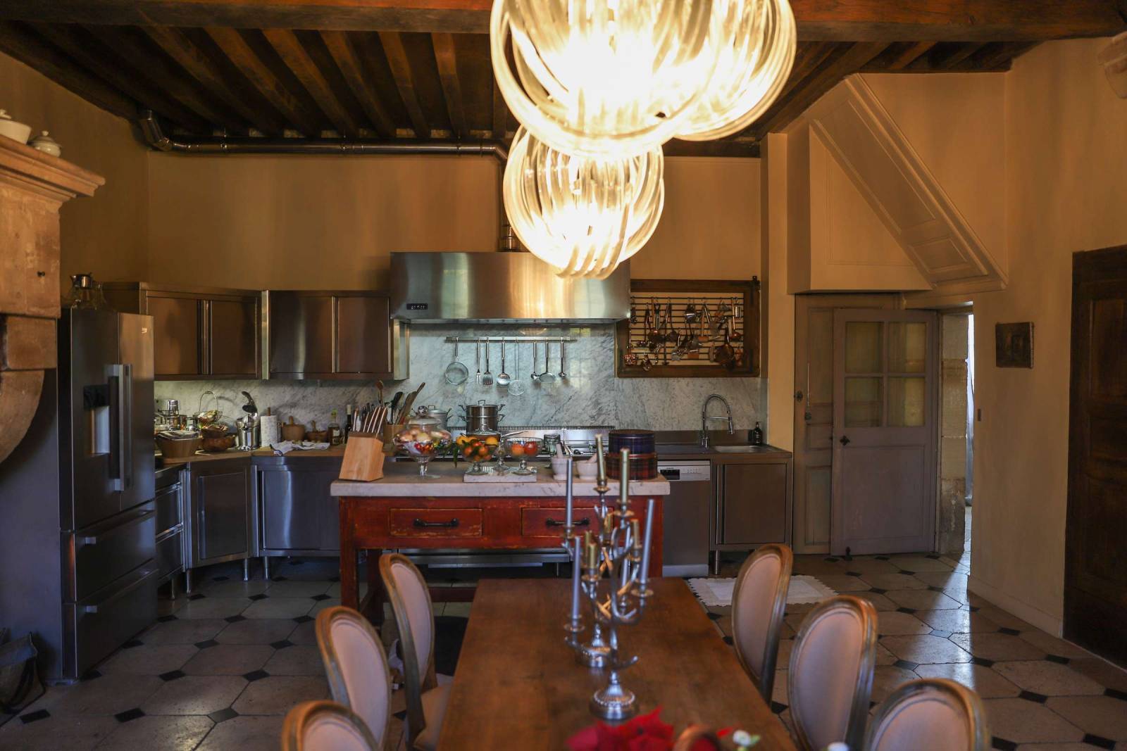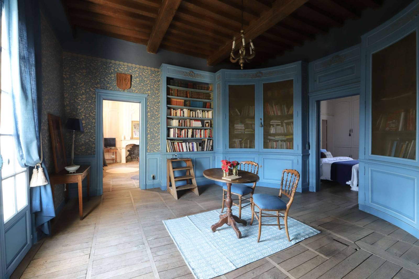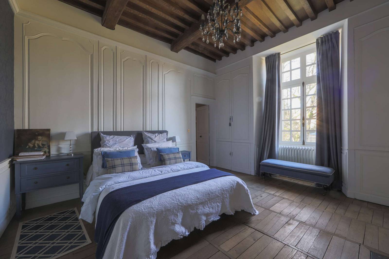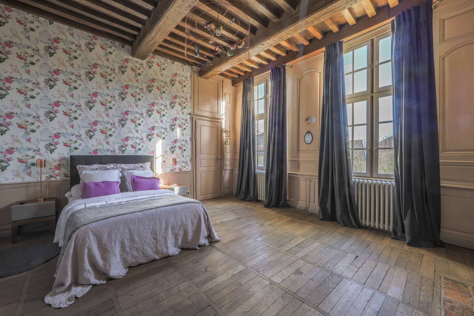 The kitchen, spacious and organised around a large historic fireplace and a central island, combines kitchen cabinetry with traditional architectural elements. The bedrooms each offer a distinct atmosphere, with antique parquet floors, floral wallpapers or light wood panelling, all bathed in natural light thanks to large windows.