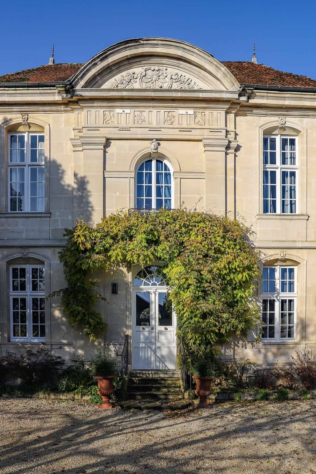 Located around 125 km from Reims, this 18th-century estate offers a classical architectural setting typical of historic French country houses. A light stone façade, gravel courtyard and tree-lined garden shape the arrival to the property. The setting immediately evokes a traditional French heritage backdrop, with a strong architectural presence and an elegant residential atmosphere.