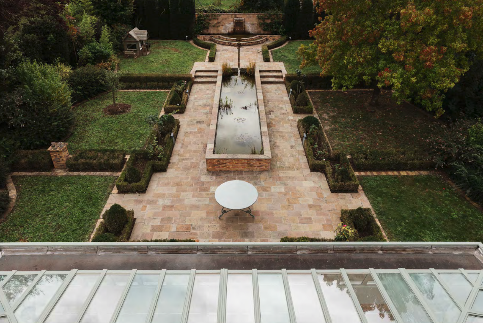 The glass-roofed conservatory/veranda and the outdoor pool add a distinctive aesthetic to the location and offer interesting perspectives for filming.