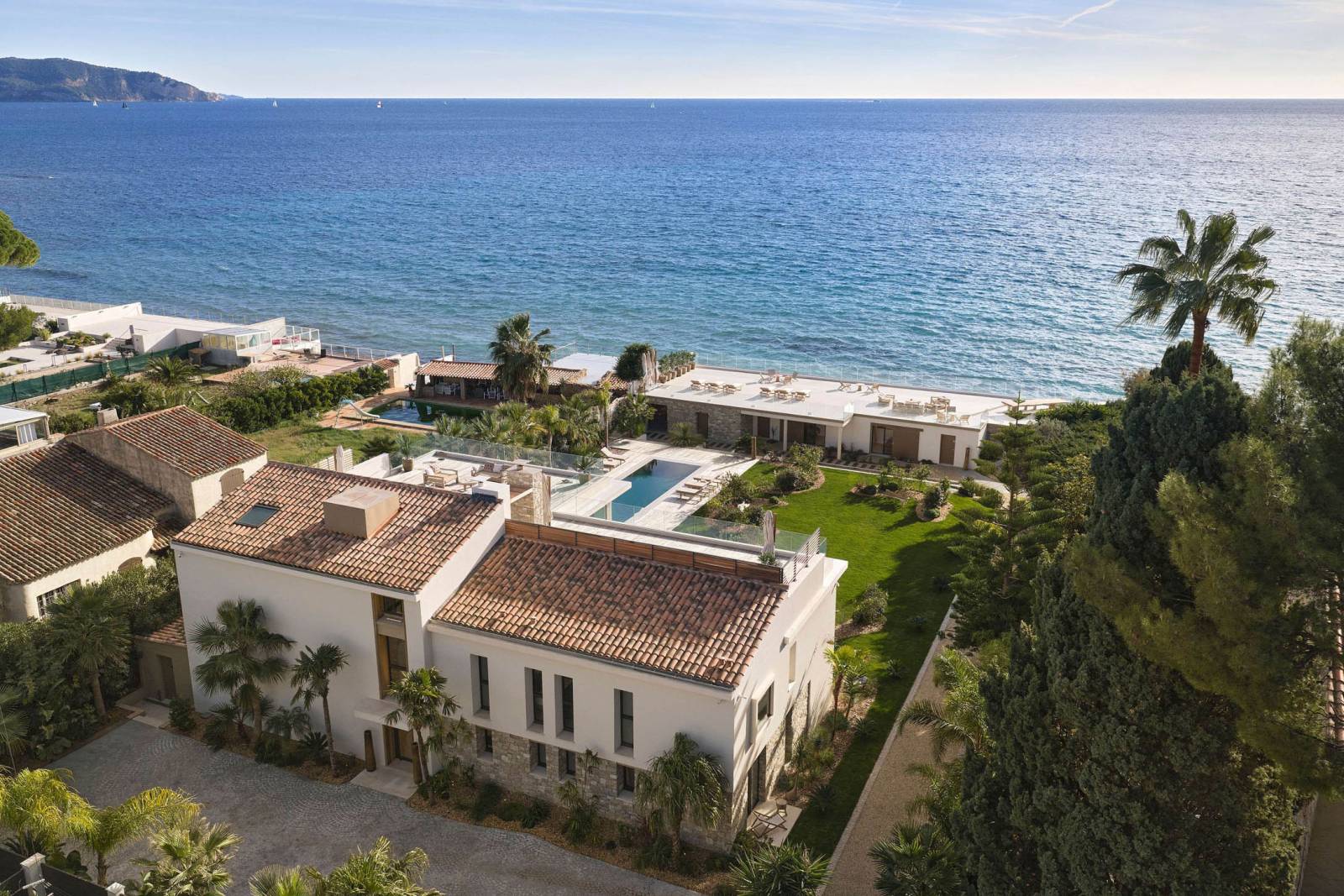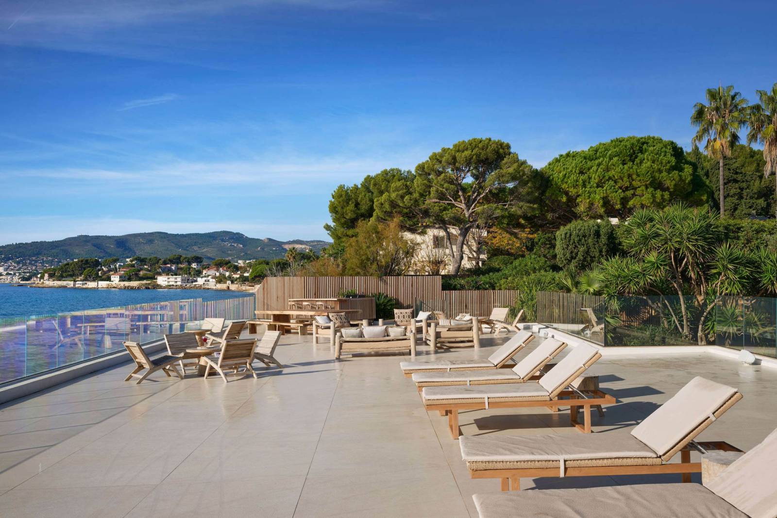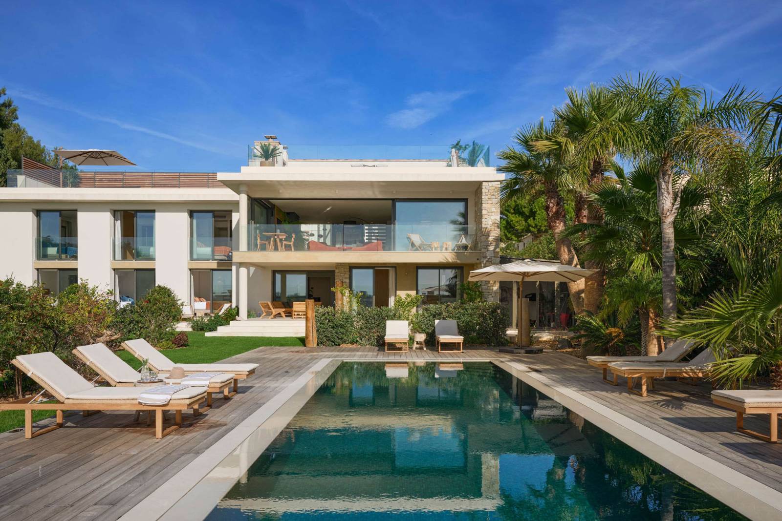 Outdoor areas function as a true set: wooden terrace around the pool, a large mineral esplanade facing the sea, and a landscaped garden (with palms and Mediterranean plants).
