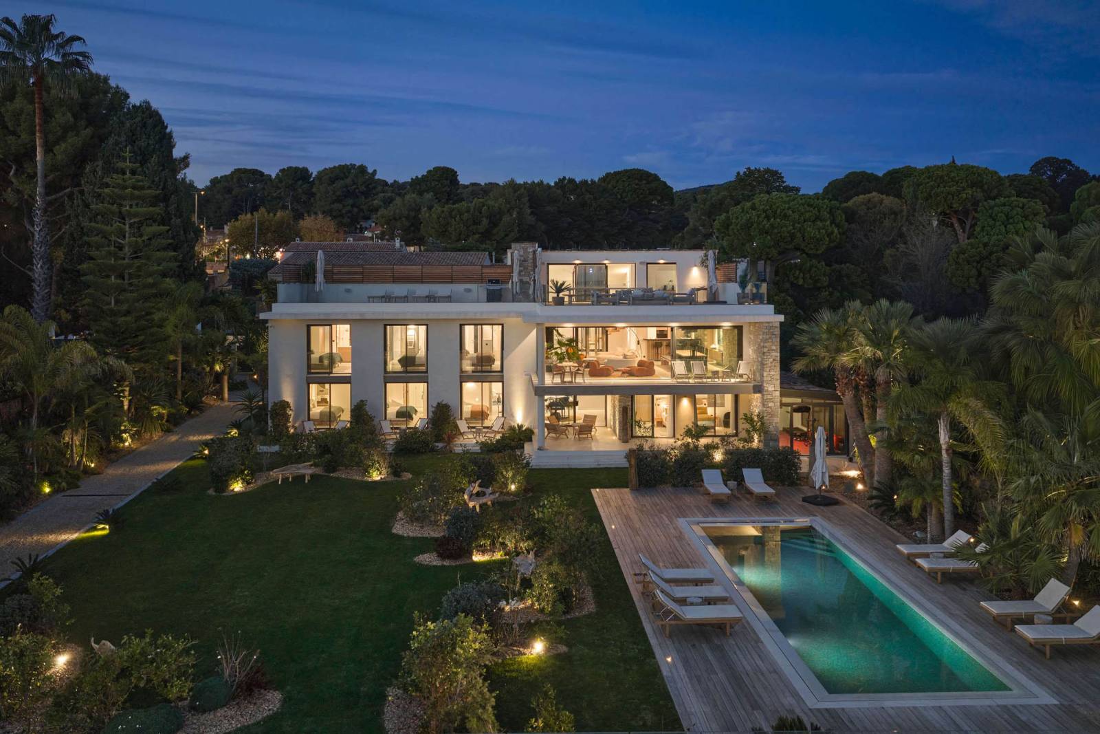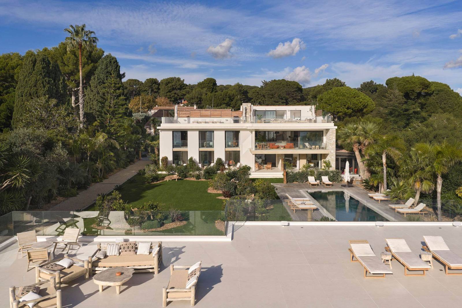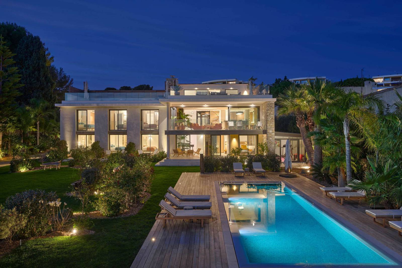 Outdoor areas function as a true set: wooden terrace around the pool, a large mineral esplanade facing the sea, and a landscaped garden (with palms and Mediterranean plants).