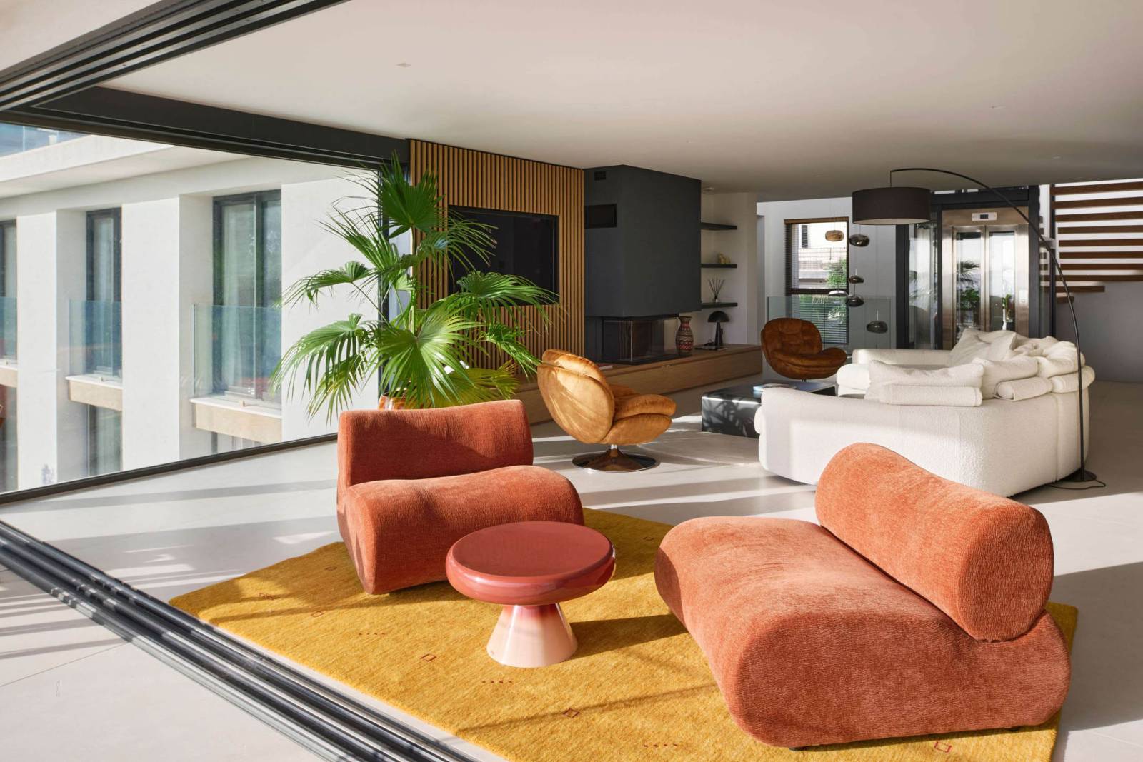 MILLIE embraces a contemporary white architectural style, with extensive glazing and large sliding bay windows opening onto the sea. Inside, light floors and white walls provide a neutral backdrop that is easy to style. Notable features include a stone wall in the living area, black pendant lights above the tables, and furniture with bold volumes: a curved white sofa, brick/orange-toned seating, and large tables for gathering a production team.