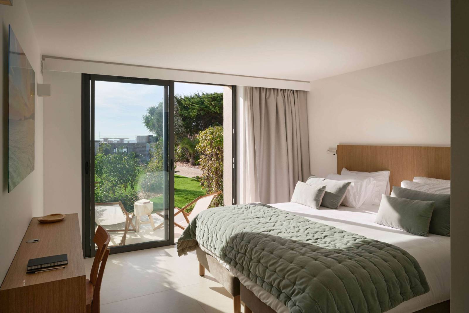 Bedrooms remain minimalist: wooden headboards, delicate pendant lights, and outdoor access via bay windows, offering multiple angles (indoor/outdoor) and variations in depth of field.