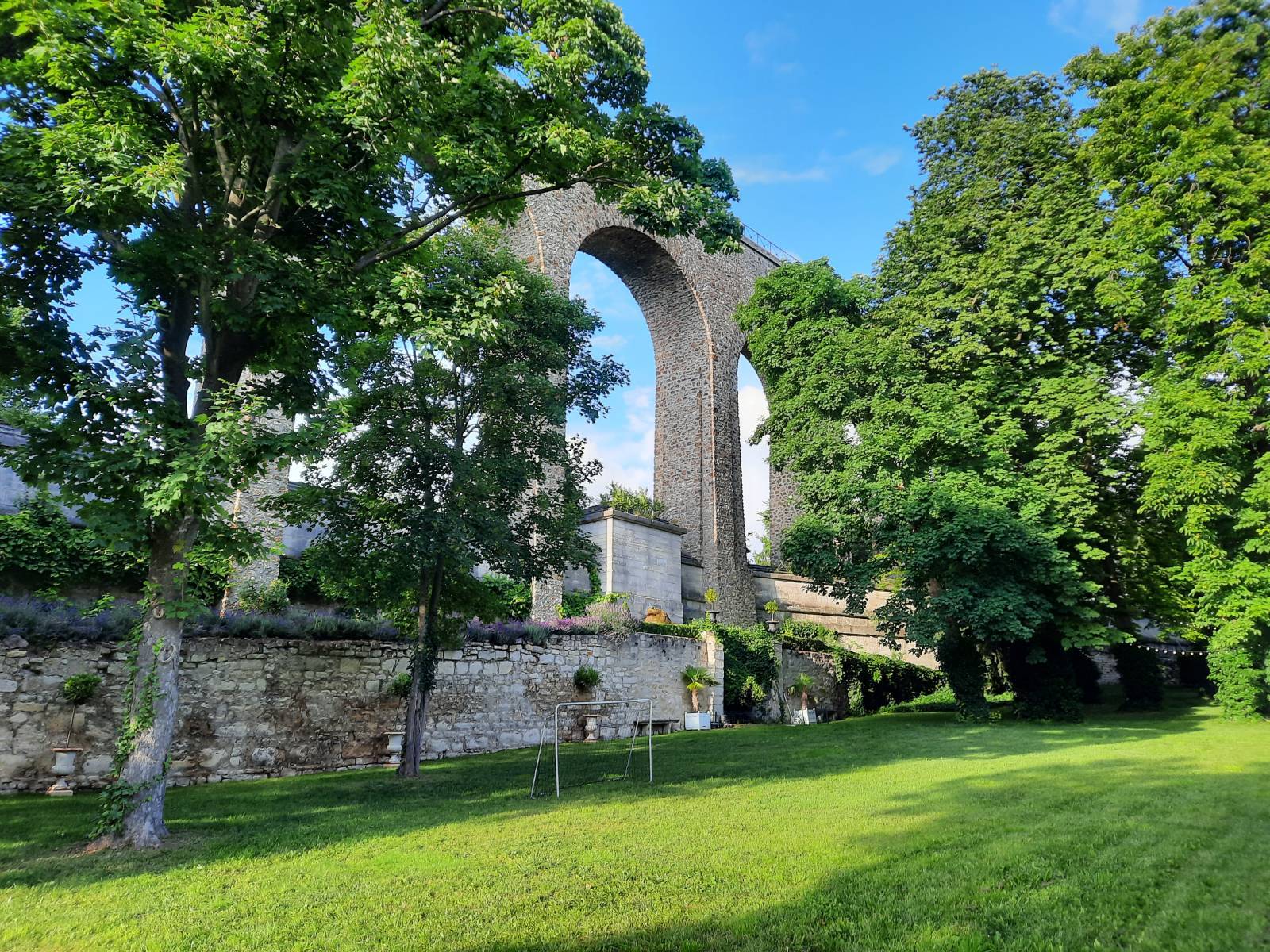 Outside, the park offers multiple settings: open lawns, dense wooded areas, and structured pathways. The stone aqueduct in the background adds a strong visual signature, especially for wide shots.