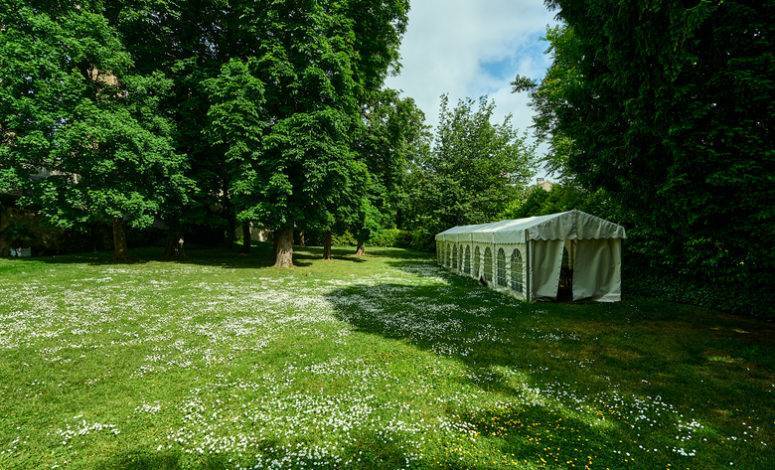 The 4,000 sqm park allows for outdoor setups, including tents and reception structures.