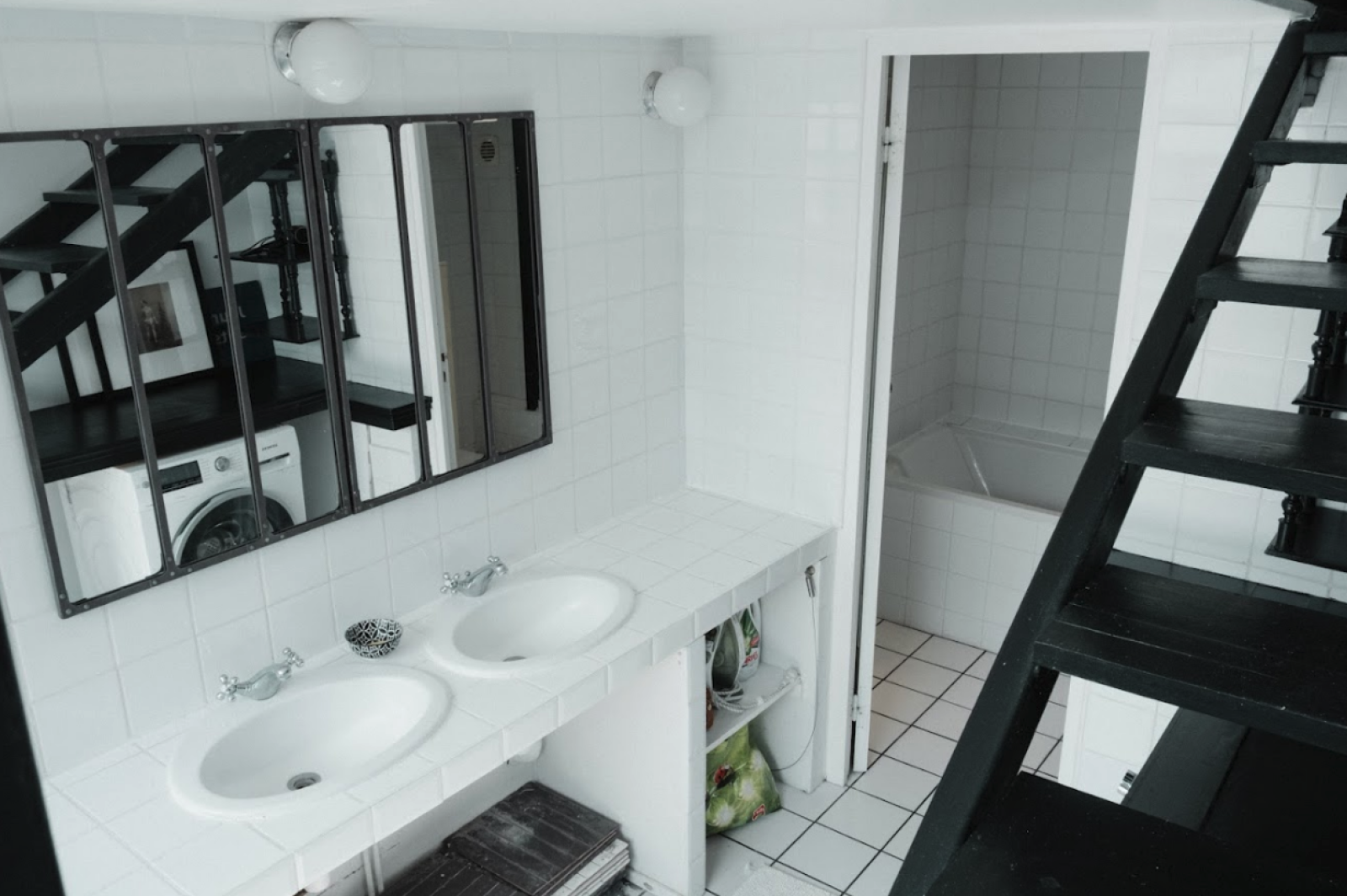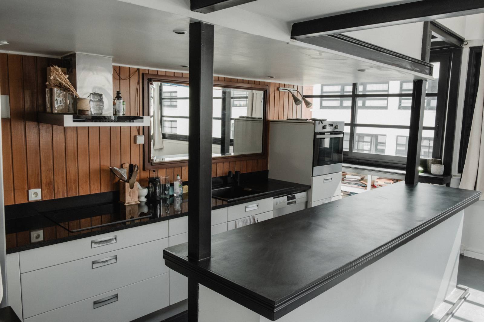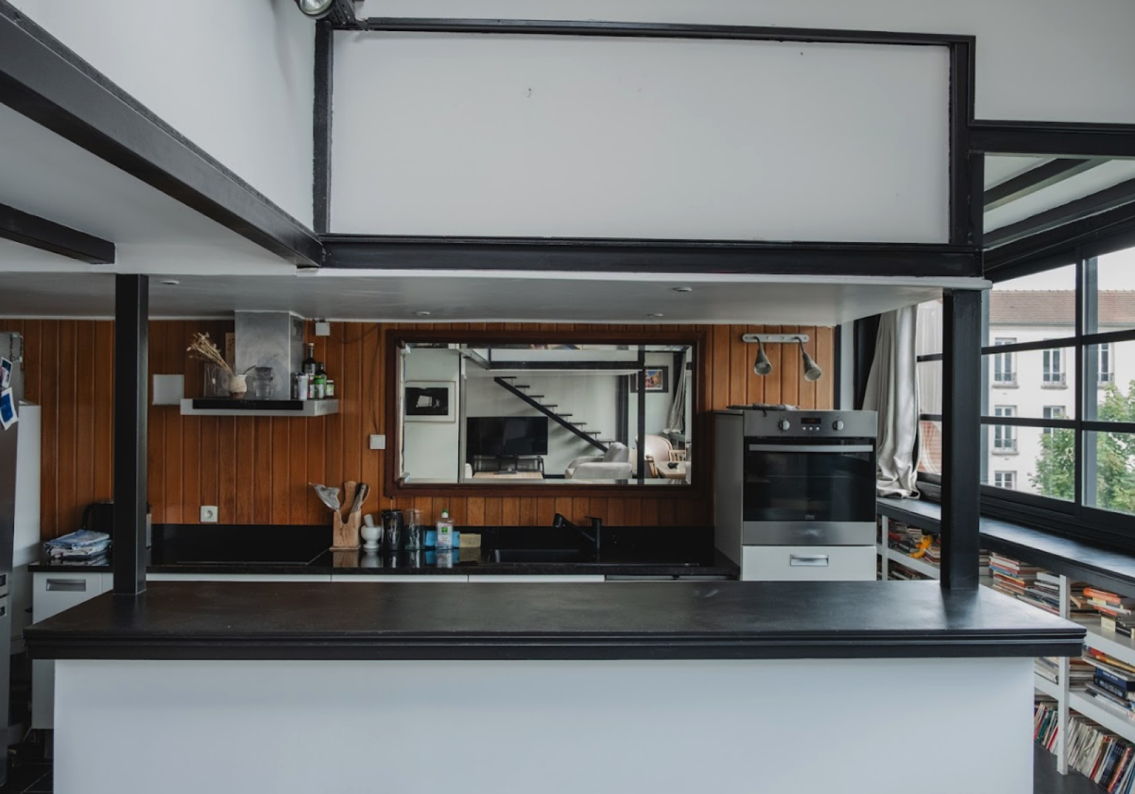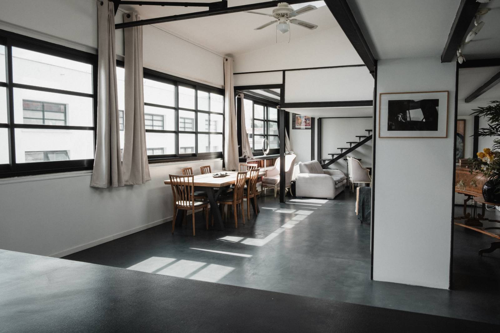 With its black and white aesthetic, black metal structure, and large rectangular window reminiscent of an artist's studio, the space offers a graphic and contemporary backdrop, ideal for impactful visual productions.