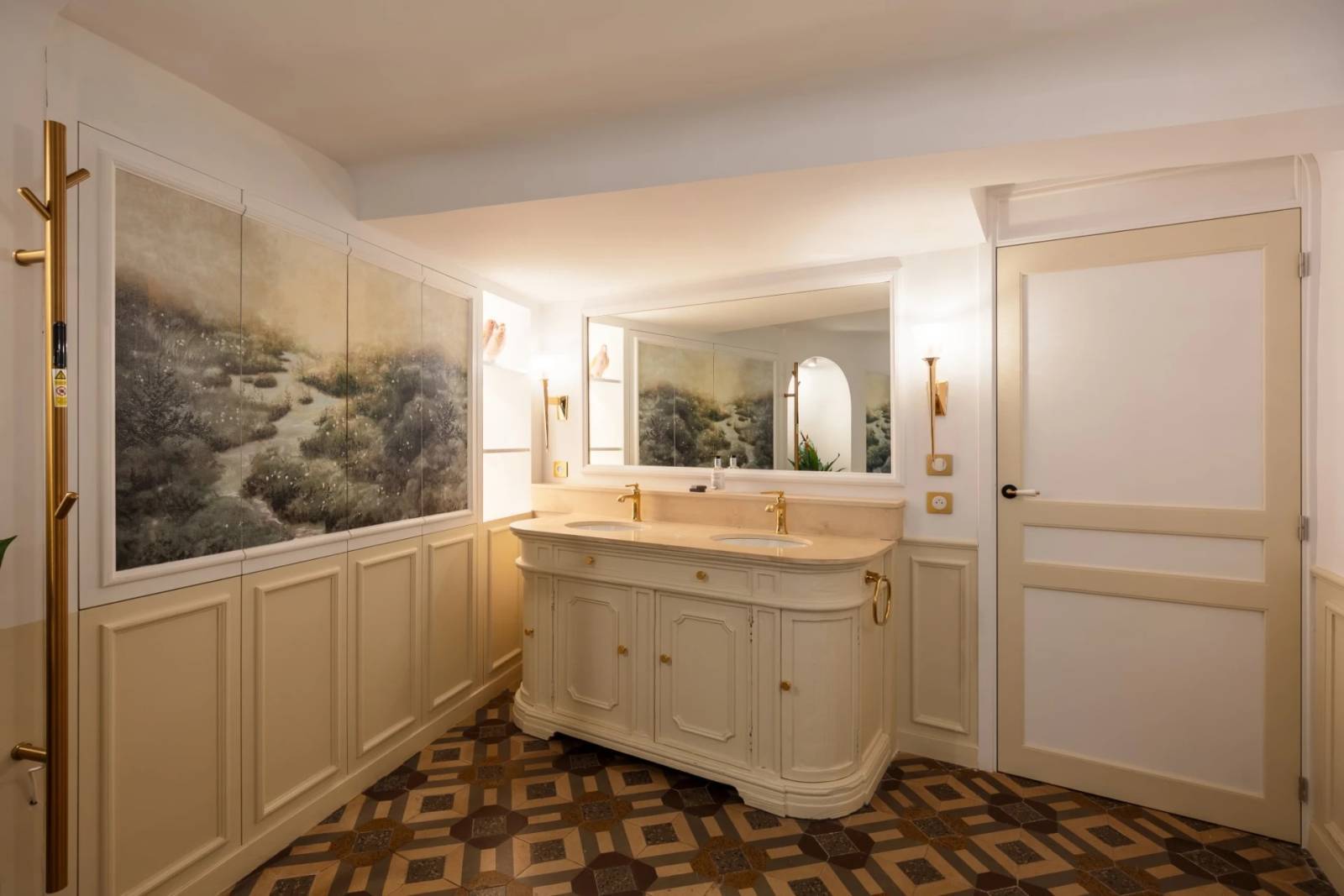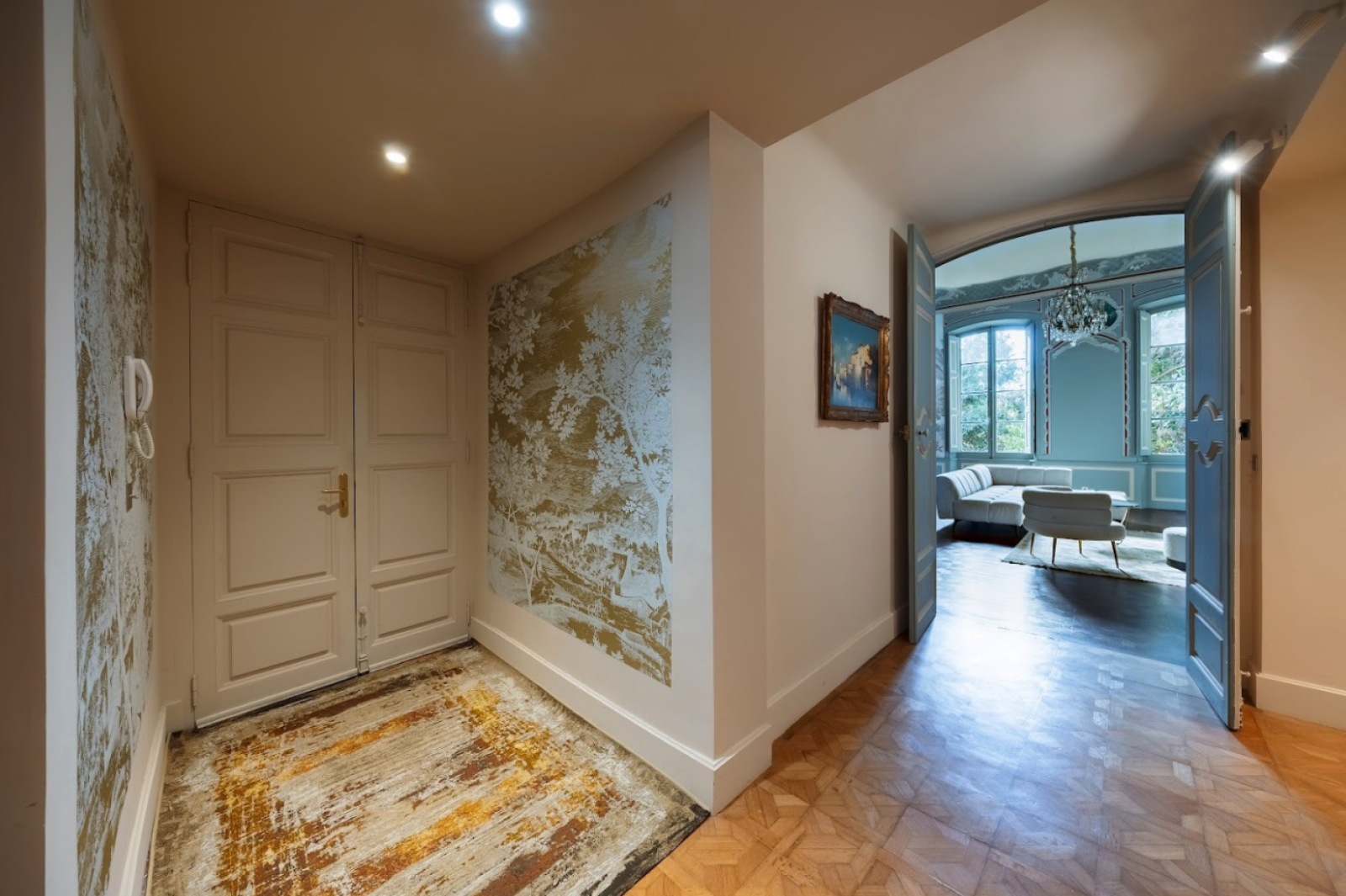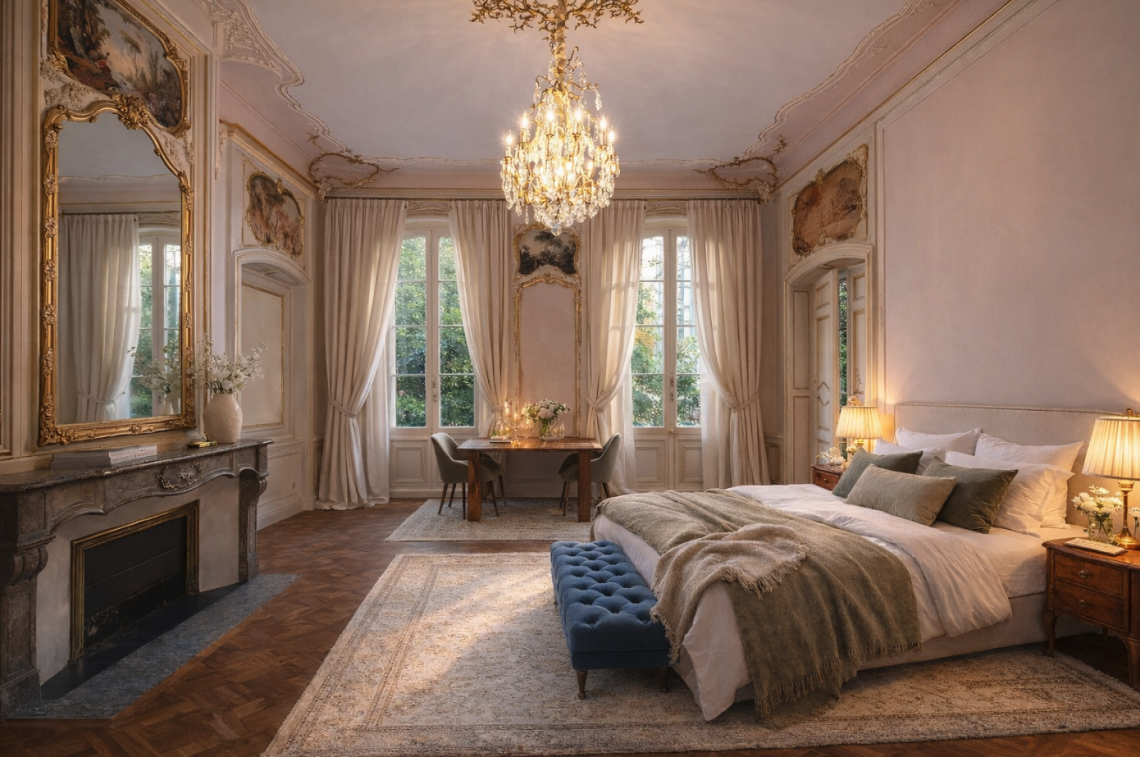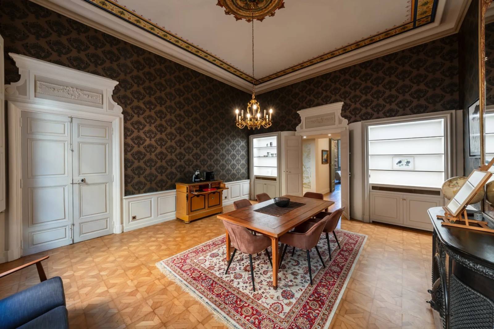 The 5-meter high ceilings, period architectural features, and 18th- and 19th-century decor create an authentic, elegant, and timeless setting.