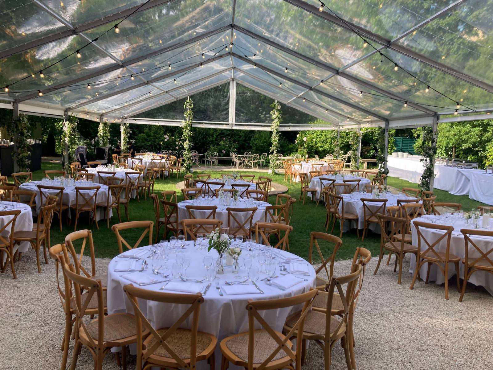 Garden layouts adaptable for cocktails or seated dinners under structure