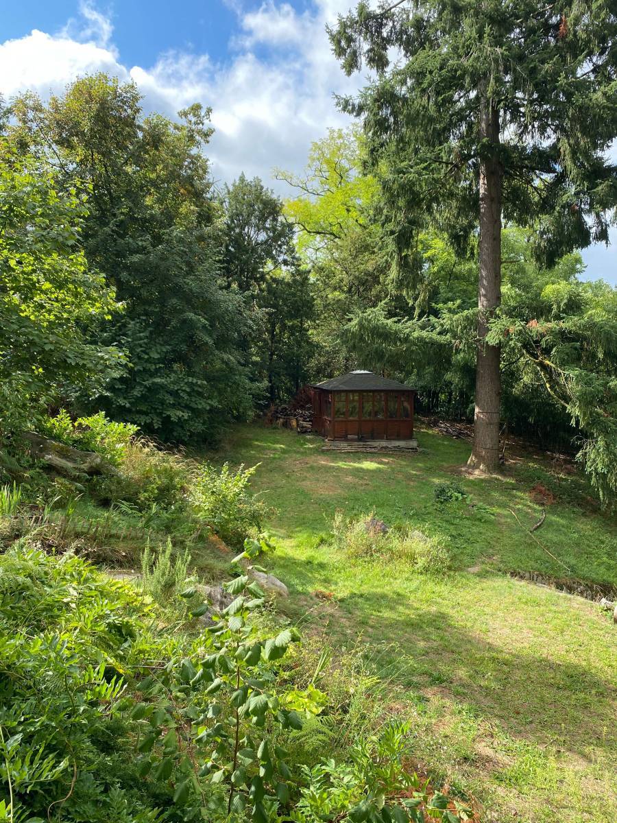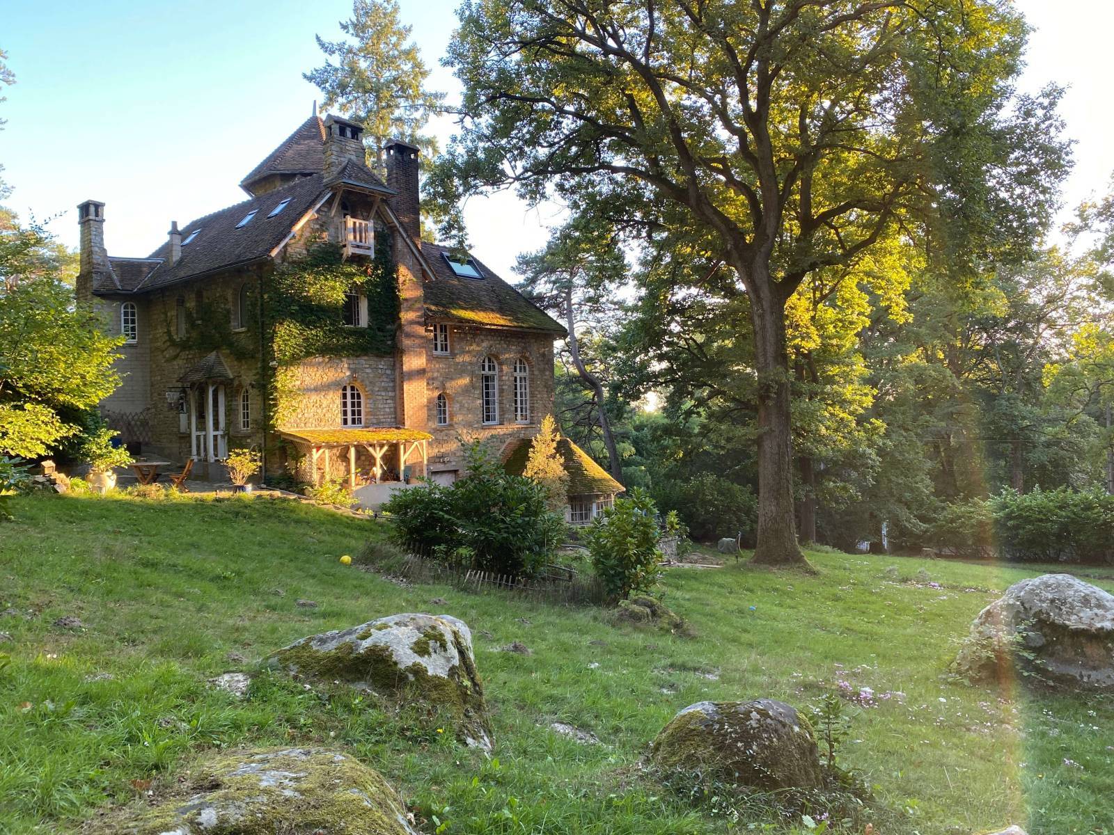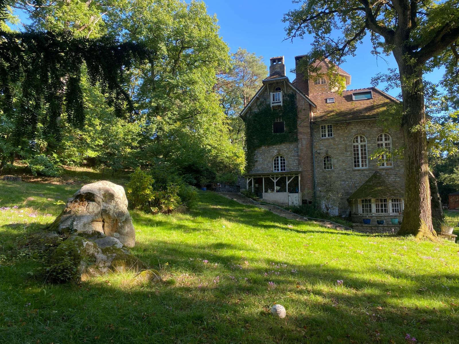 The strength of this location lies in its contrast. An old stone house that embraces its imperfections, set within a 10,000 m² green park. Tall trees, open clearings, denser wooded sections, and moss-covered rocks create natural relief and a strong undergrowth feel.