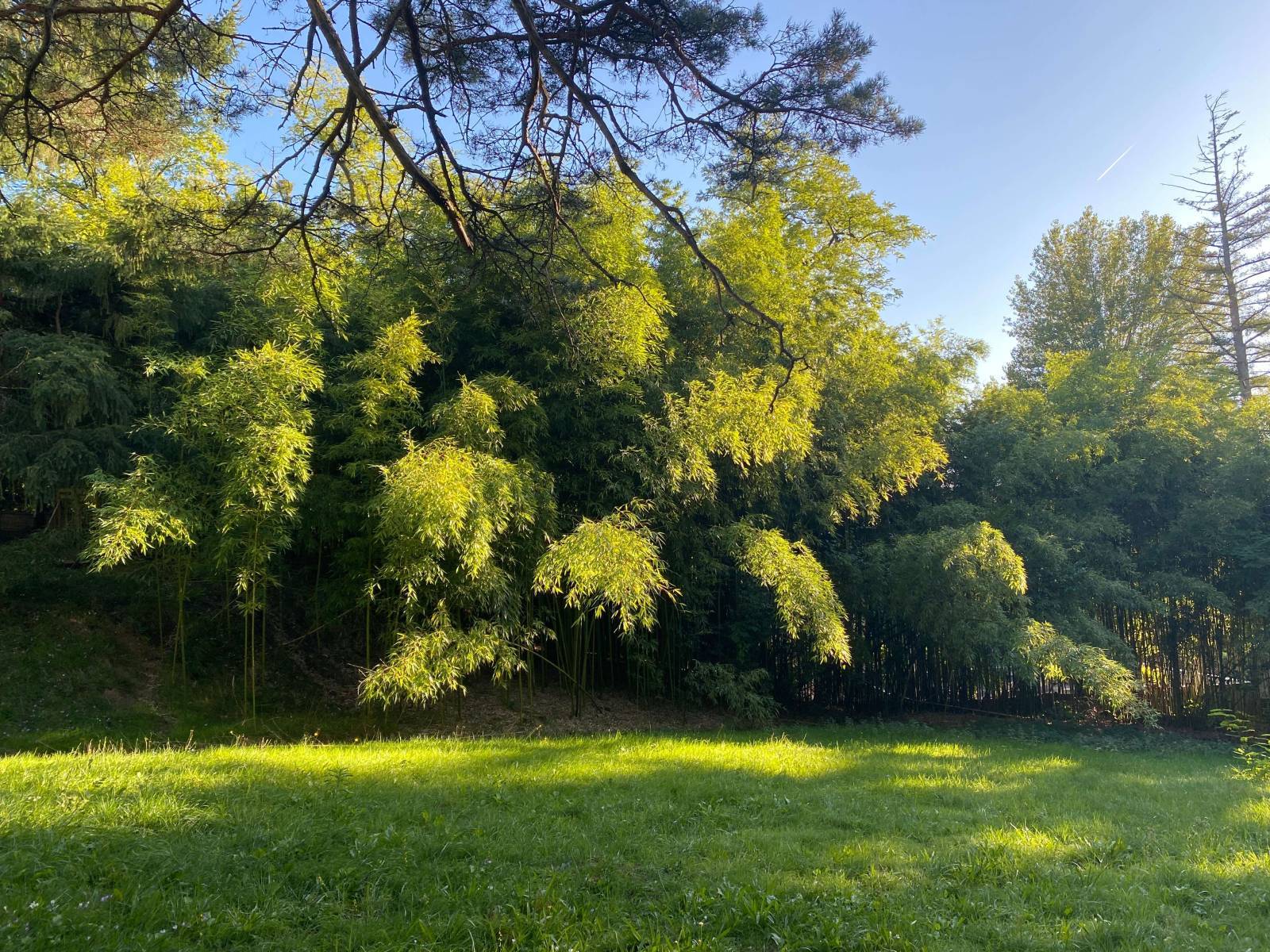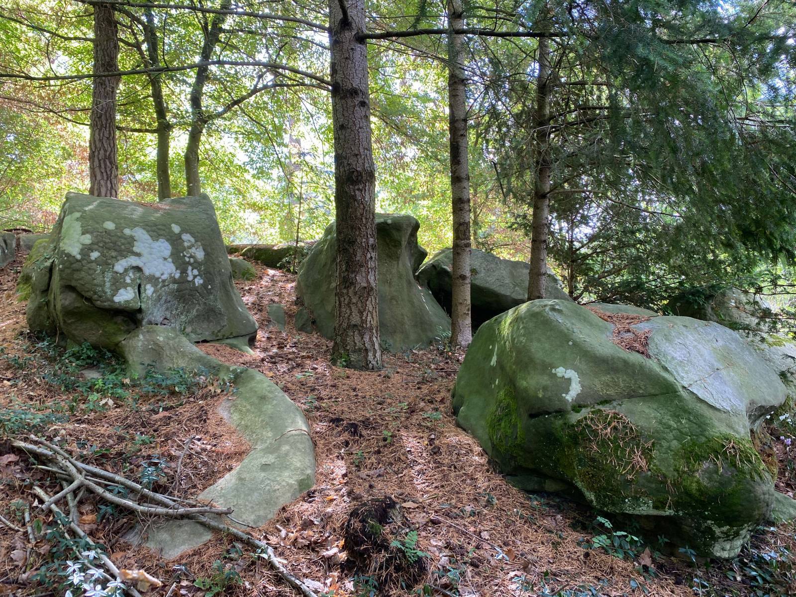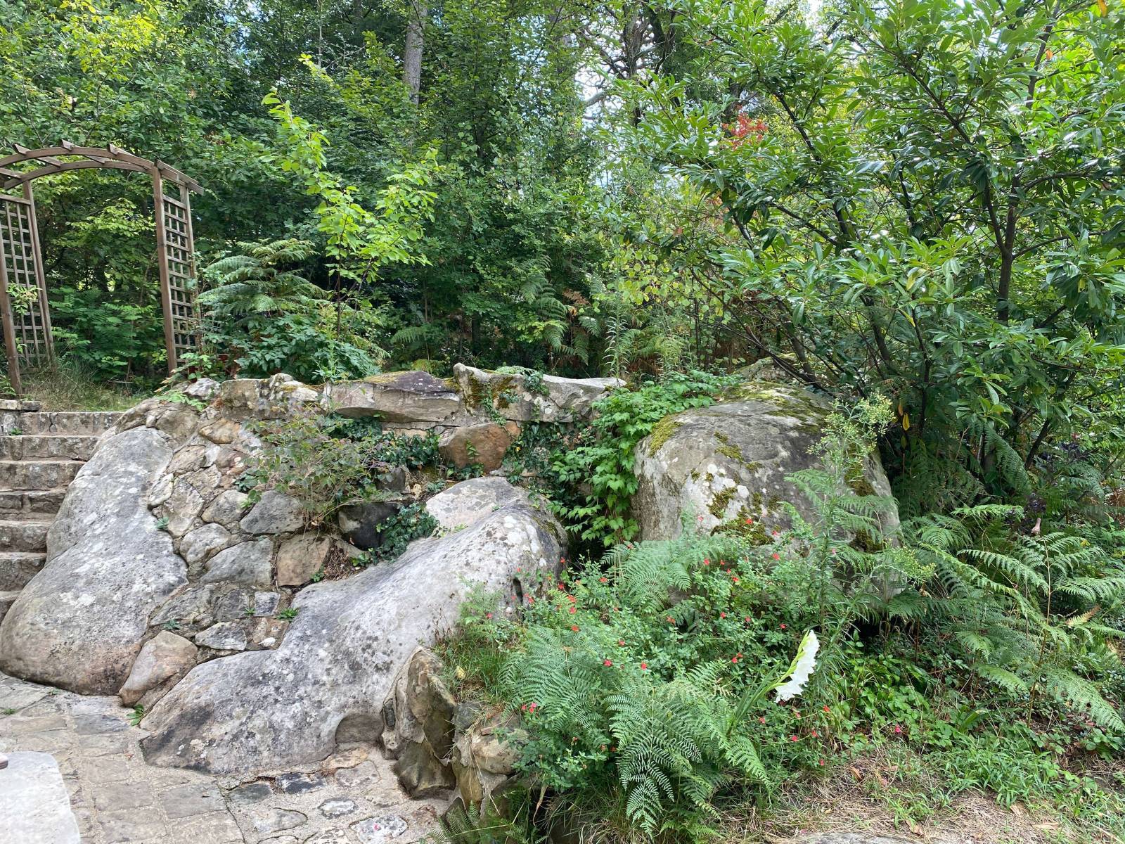 The strength of this location lies in its contrast. An old stone house that embraces its imperfections, set within a 10,000 m² green park. Tall trees, open clearings, denser wooded sections, and moss-covered rocks create natural relief and a strong undergrowth feel.