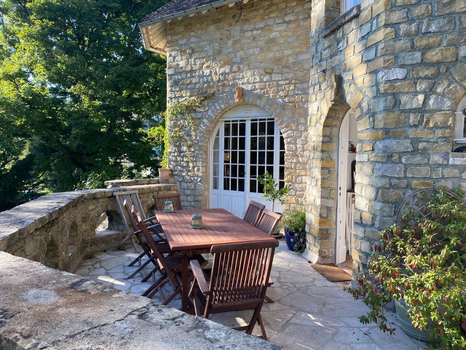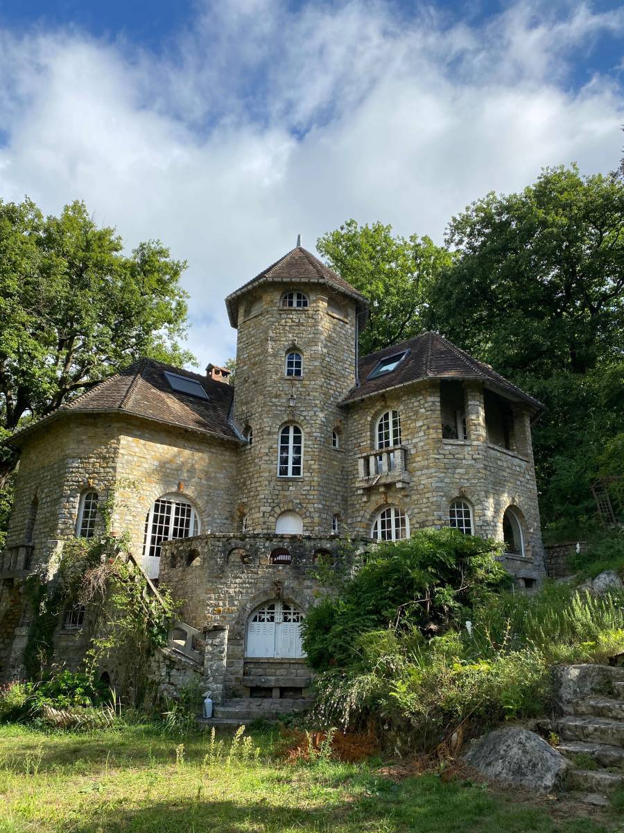 From the exterior, the stone house reveals a tower, arched windows, and a mineral terrace. The arches, textured stone, and tree shadows immediately create a charming, cinematic feel.