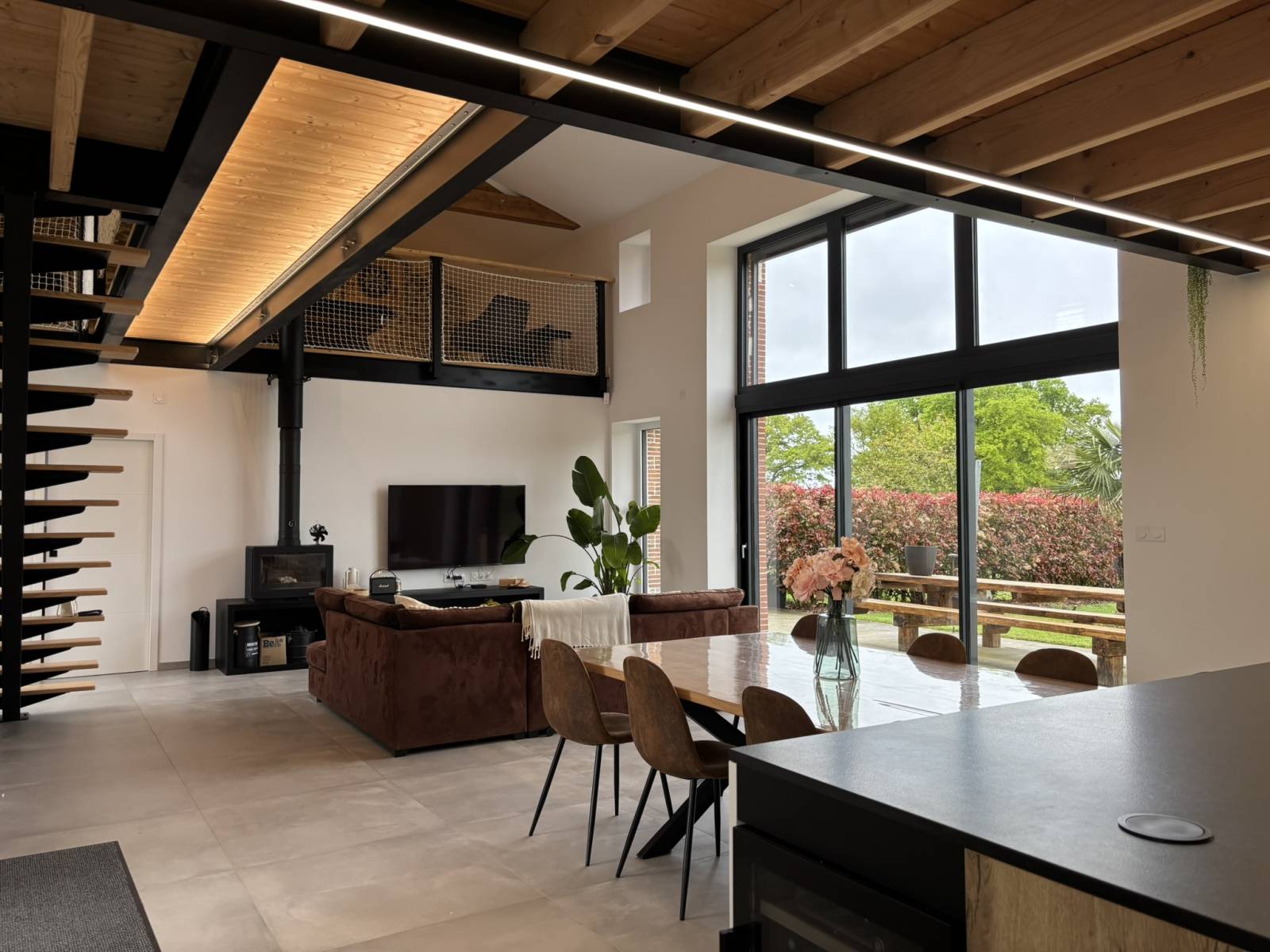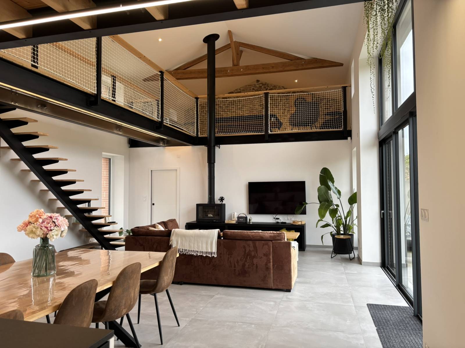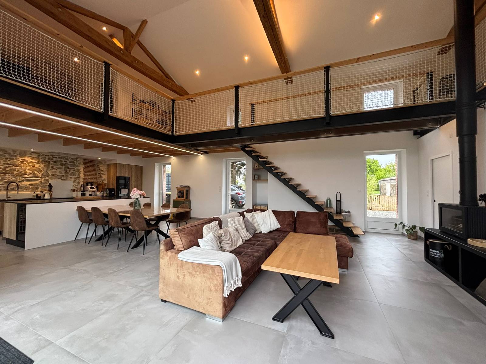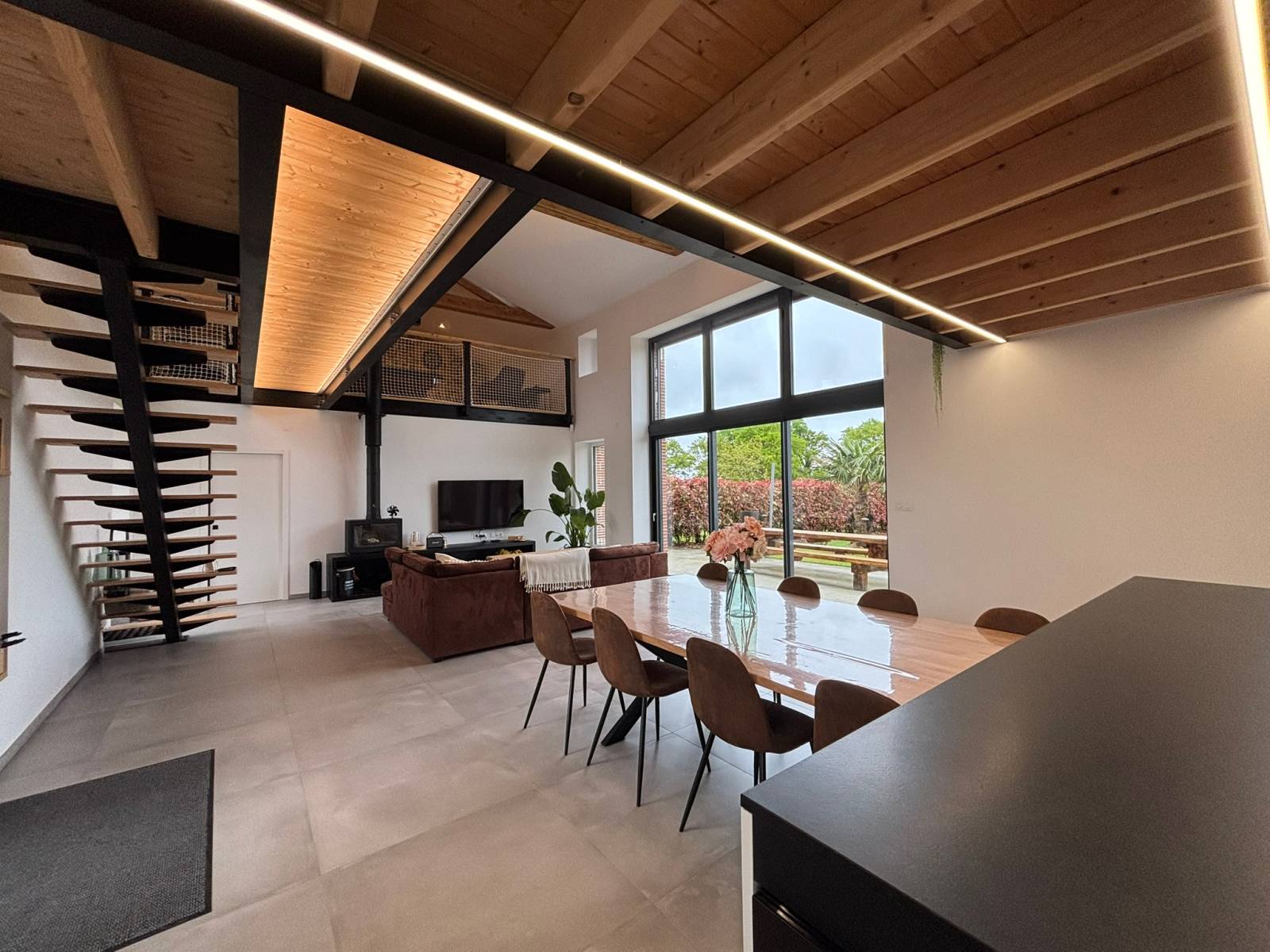 From the entrance, the tone is set: a spacious living room bathed in light welcomes you, with a generous ceiling height and a warm atmosphere. The living area is designed as an open space, with a modern and friendly open kitchen equipped with a solid wood central island.