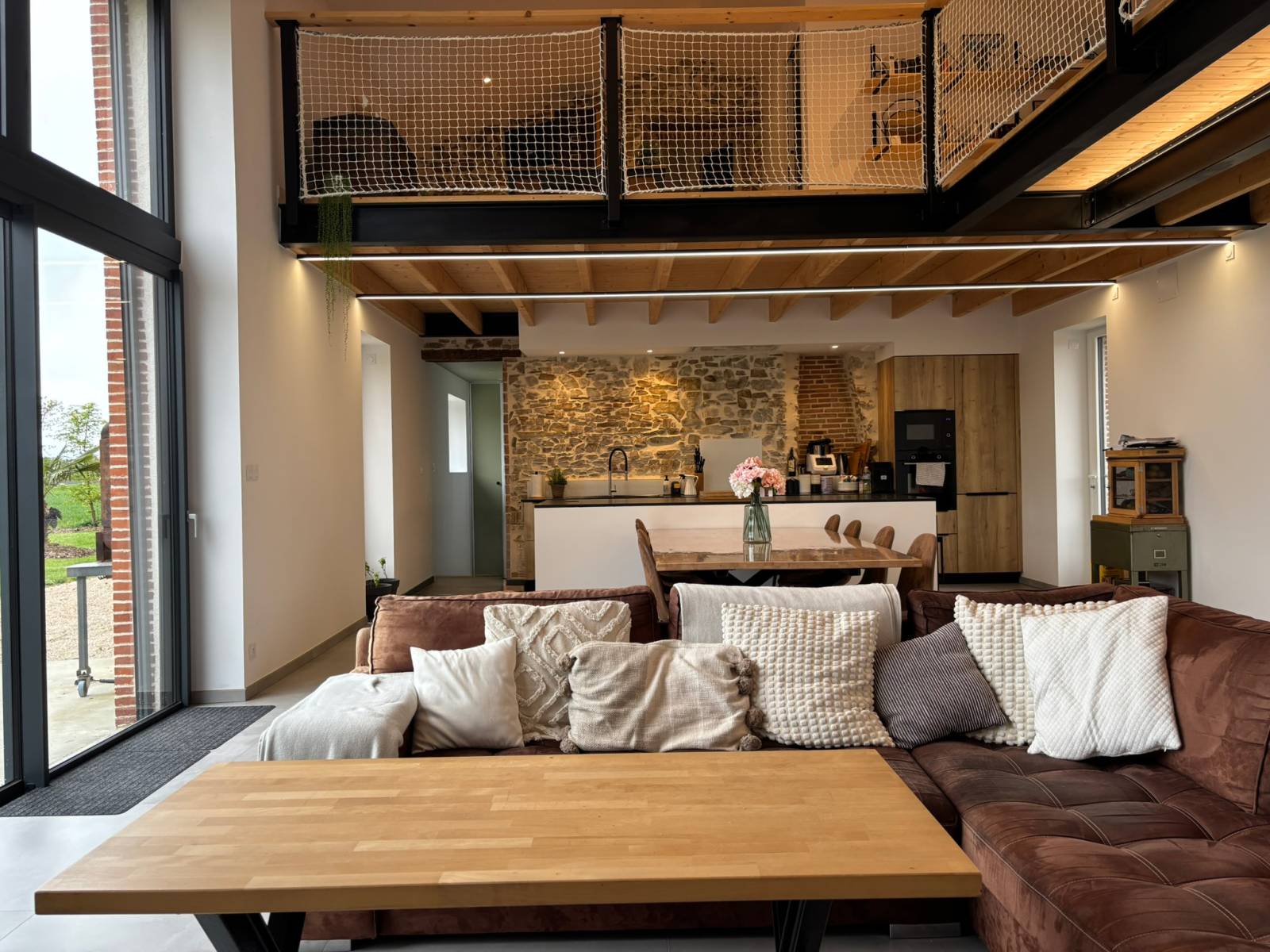 Noble materials, such as the exposed stone wall, bring character and authenticity to the whole, creating a subtle contrast between tradition and modernity.